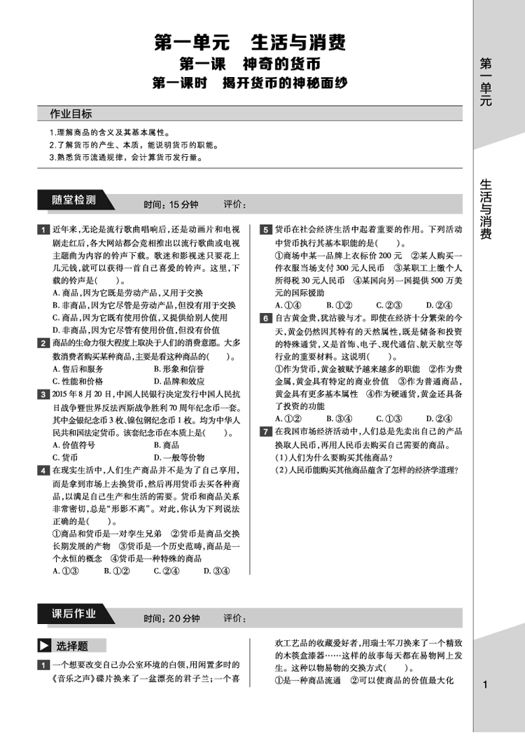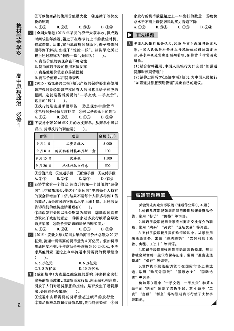 人教政治 必修1 教材完全学案 17版