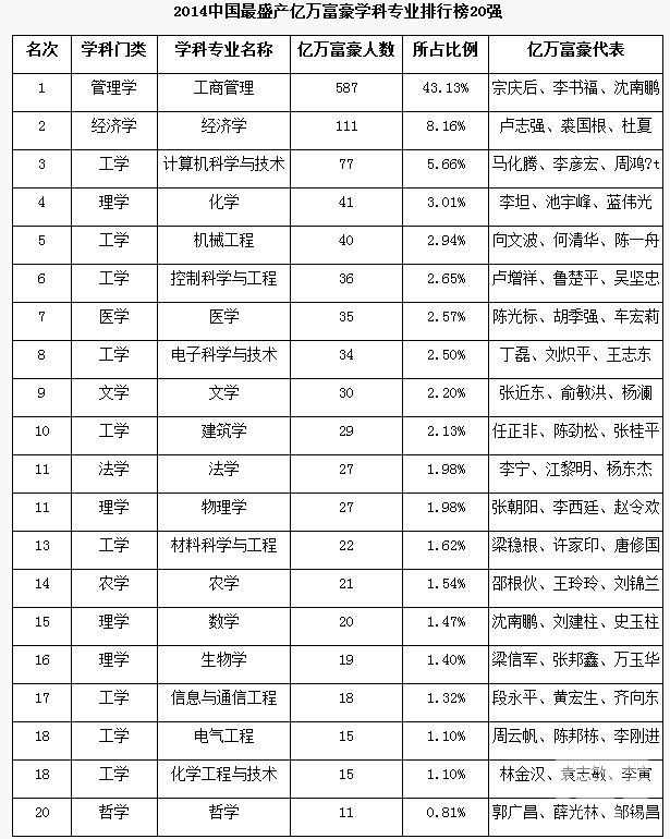 2014年5月27日,中国校友会网最新编制完成《2014中国大学学科专业评价报告》,公布最新2014中国两岸四地大学学科专业排行榜和2014中国大学各学科门类排行榜。报告显示,北京大学、清华大学和中国人民大学问鼎2014中国大学学科专业排行榜前三甲,香港大学、台湾大学和台湾交通大学雄居2014中国港澳台大学学科专业排行榜前三强。报告首次发布2014中国大学各学科门类排行榜,北京大学勇夺理学、医学、历史学、文学和哲学等5个学科门类第一,中国人民大学赢得法学、管理学和经济学等3个学科门类第一,清华大学、北京师范大学、中国农业大学、中央美术学院分别荣获工学、教育学、农学和艺术学等学科门类第一。报告最新发布2014中国最盛产亿万富豪大学专业排行榜,旨在为2014年立志创业的全国高考学子填报志愿提供参考。 中国富豪榜15年3000企业家上榜,6成多亿万富豪拥有大学学历堪称“创业楷模” 改革开放30多年来,中国经济取得了举世瞩目的发展成就,全国各地掀起一轮又一轮的自主创业热潮,涌现出了一大批拥有国际竞争力和世界影响力的高新技术企业和民营企业家。1999年,中国诞生了第一个中国富豪排行榜,以其对企业家财富特有的评估方式对中国民营经济“舵手”进行追踪。中国高考志愿填报咨询专家、中国校友会网大学研究团队专家、厦门大学博士冯用军副教授指出,1999-2013年全国有3000名企业家先后登上胡润中国百富榜、福布斯中国富豪榜、南方周末中国(内地)人物创富榜和新财富500富人榜等榜单;亿万富豪企业家是改革开放30多年来中国大学继科学家、政治家之外对国家和社会又一大人才贡献,中国富豪榜上榜企业家大多是我国优秀企业和国内外上市公司的创始人和合伙人等,他们的商业成就、经济贡献和社会责任得到了社会各界特别是就读高校的高度认可,成为其母校对外宣传的重要“名片”,堪称“中国大学生创业楷模”。 最新发布2014中国最盛产亿万富豪大学专业排行榜,为立志创业考生填报高考志愿提供参考 报告指出,毕业生中企业家校友数量多少是评价一所大学毕业生质量、创新创业教育水平高低的最准确、最合理、最公正和最客观的指标,体现了一所大学对国家经济发展的人才贡献和推动作用。中国高考志愿填报咨询专家、中国校友会网大学研究团队专家、厦门大学博士冯用军副教授指出,在中国校友会网大学研究团队调查到的1999-2013年福布斯、胡润、南方周末和新财富等中国富豪榜上榜富豪企业家中,近1800人拥有高等教育背景,占总数的62.25%,毕业于国内外400多所高等院校和科研院所,基本上是在1978年我国恢复高考之后完成大学学业的。为了让全国2014年高考考生了解中国亿万富豪企业家的求学专业,中国校友会网大学研究团队特别发布了2014中国最盛产亿万富豪大学专业排行榜,旨在为有自主创业远大理想的优秀学子选择适合自己的大学和学科专业提供参考。 工商管理、经济学和计算机专业最盛产中国亿万富豪 报告显示,在1999-2013年胡润中国百富榜、福布斯中国富豪榜、南方周末中国(内地)人物创富榜和新财富500富人榜上榜的拥有高等教育背景的1800名亿万富豪企业家中,“工商管理”专业造就的中国亿万富豪人数最多,高达587人,雄居中国校友会网2014中国最盛产亿万富豪学科专业排行榜榜首,约占总数的43.13%,著名的亿万富豪有宗庆后、李书福、沈南鹏等。经济学学科专业有111人,位居第二,著名富豪有卢志强、裘国根、杜夏等;计算机科学与技术专业有77人,名列第三,著名富豪有马化腾、李彦宏、周鸿?t等;化学专业有41人,位居第四,著名富豪有李坦、池宇峰、蓝伟光等;机械工程专业有40人,位居第五,著名富豪有向文波、何清华、陈一舟等。 控制科学与工程专业有36人,名列第六,著名富豪有卢增祥、鲁楚平、吴坚忠等;医学学科专业有35人,居第七,著名富豪有陈光标、胡季强、车宏莉等;电子科学与技术专业有34人,名列第八,著名富豪有丁磊、刘炽平、王志东等;文学专业有30人,位列第九,著名富豪有张近东、俞敏洪、杨澜等,建筑学专业造就29位亿万富豪,位居第十,著名富豪有任正非、陈劲松、张桂平。 管理学和经济学专业造富能力最强,理工科计算机专业“异军突起” 中国高考志愿填报咨询专家、中国校友会网大学研究团队专家、厦门大学博士冯用军副教授分析指出,整体而言,1999-2013年胡润、福布斯和新财富等中国富豪榜上榜亿万富豪就读专业明显呈现出集中于管理学、经济学、工学和理学等学科门类下的热门专业的特点,其中,工商管理专业“一枝独秀”,堪称“中国亿万富豪摇篮专业”,经济学专业毕业的亿万富豪屈居第二,理工科的计算机专业“异军突起”,毕业的亿万富豪位列第三。具体来看,人文社会科学领域中盛产亿万富豪的是工商管理和经济学等热门专业,理工科盛产亿万富豪的是计算机科学与技术、化学、机械工程和控制科学与工程等较为热门的学科专业。对于有自主创业远大理想的优秀学子而言,这些学科专业可以说是其最佳的高考志愿选择。