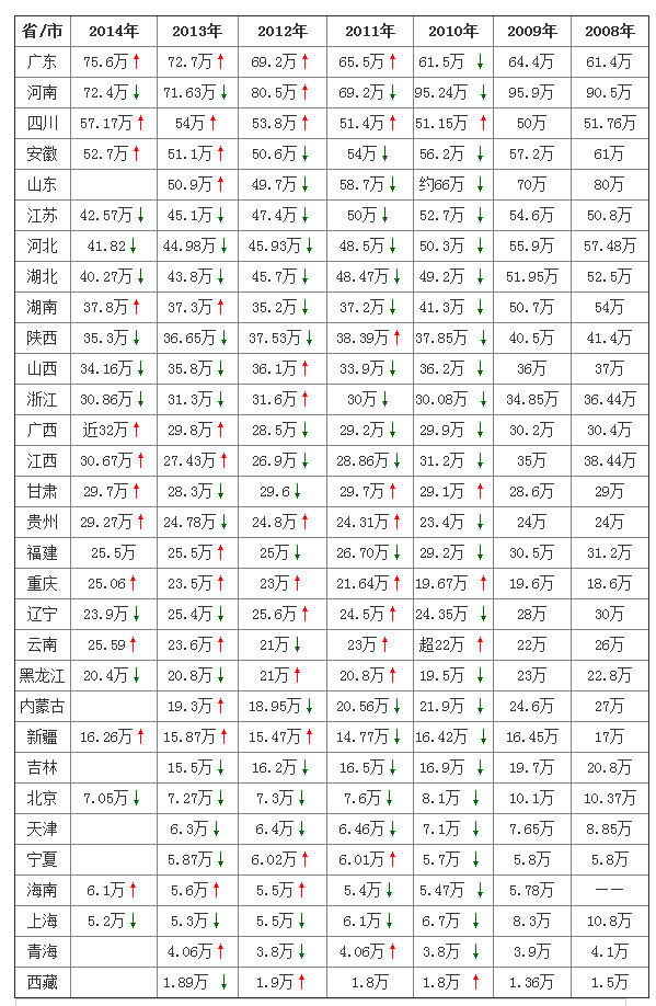 新浪教育讯 据教育部统计,2014年全国高考报名939万人,较去年增加27万人,增幅3%。其中普通高中应届生增加26万人;中职毕业学生增加11万人;复读生减少10万人。报名学生中农村户籍学生增加17万人。 数据显示,河南2014高考人数为72.4万,实现“六连降”,高考压力将进一步减小。而广东高考报名人数达到75.6万人,成为新的“考生第一大省”。 “广东将会成为考上好学校最难的一个省。”——广东省教育厅厅长罗伟其 “广东考生上北大几率只有北京学生的1%。”——北京大学法学院教授张千帆