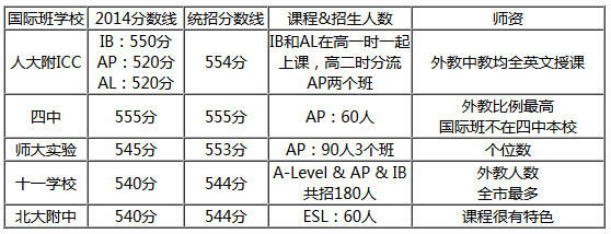 众所周知,“国际高中”是实现跨区择校的一个重要途径。在公立高中里,人大附、四中、师大实验、十一学校和北大附中五所中学的国际班实力较强。 ![]() 1.什么是国际班? 从2003年开始,北京已有18所高中开办国际班。主要分中美与中英合作两种,考试合格后,可获得普通高中毕业证书和国外高中相应的毕业证书。课程分别为IB课程、A-Level课程和AP课。IB课程主要指IB高中文凭课程(IBDP),学生不仅要学习文科课程,理科课程甚至艺术方面的专业课都要学,还要完成各种论文和参加社会活动。A-Level课程是英国本土高中课程,学制为两年,学生可以根据自己的情况自由选课,一般学三四门课程,中国学生大多数会选理科的科目,所以又被称作“应试洋高考”。AP课程是美国大学理事会提供的在高中授课的大学课程,目的是给一些优秀的学生提前学习大学课程、得到一定成绩后获得大学学分提供机会。 2.五所最强国际班都有哪些项目? ![]() 3.五所国际班的招生与录取 所有高中国际班都是面向全市进行招生的,属于提前批次。除中考分数线要达标外,报考大部分国际班的考生都要参加提招加试。虽然每所学校对考生的要求不同,但大多测试考生的英语水平。 ![]() |