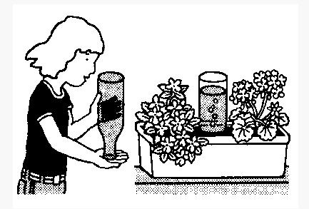 ![]() 把葡萄酒瓶灌满清水,用手捂住瓶口,然后猛地翻过来,口朝下插在花盆中。 用这个方法,瓶中的水可以自动灌溉植物好几天。瓶中的水流入土中,待周围的土壤潮湿以后形成密封状态,空气无法注入瓶中,瓶中的水即不再外流。 天气暖和的时候,你可以观察到瓶中升起的气泡要比天冷的时候多——这说明在热天,植物需要更多的水。 |