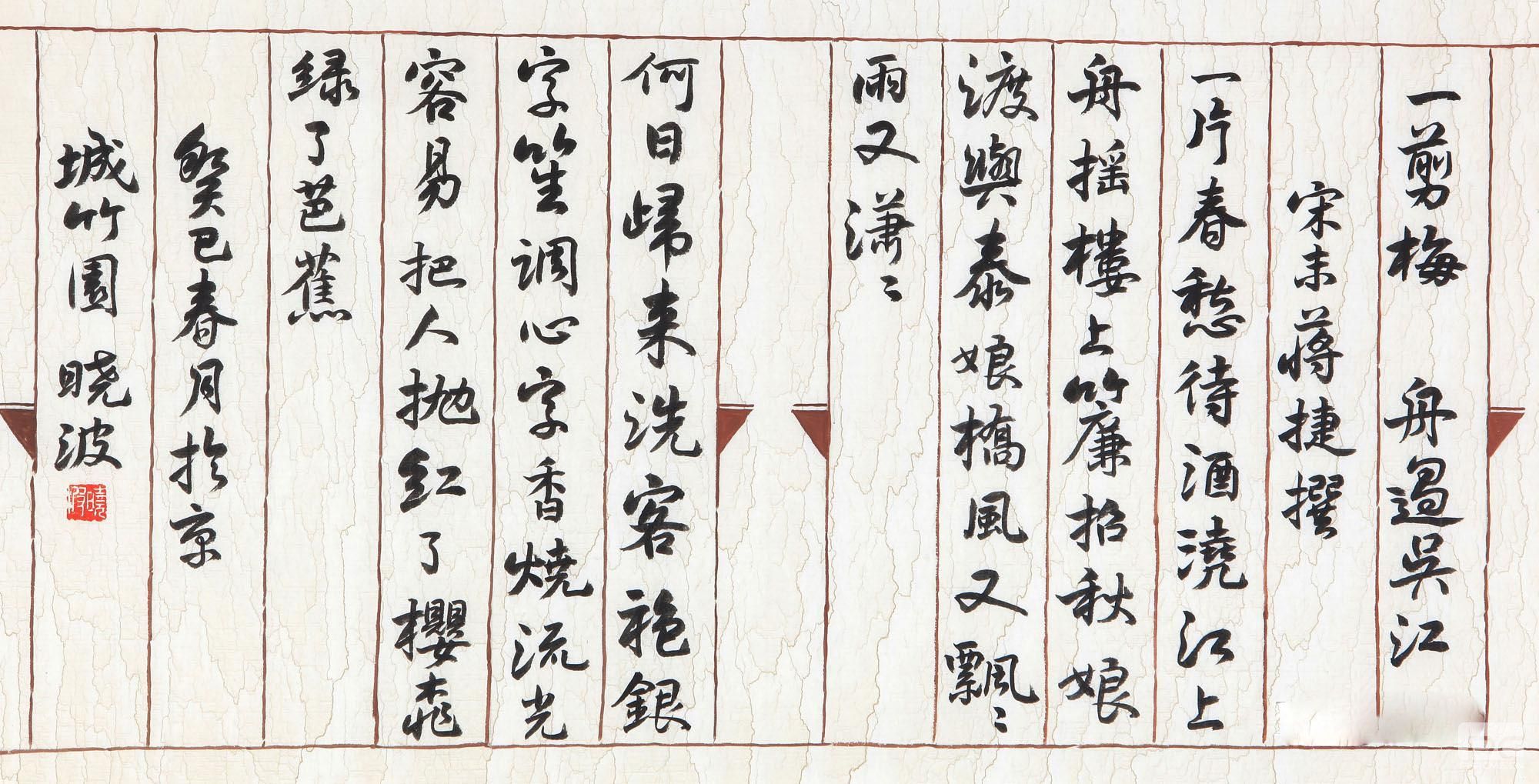 ![]() 【原文】 一剪梅·舟过吴江 蒋捷 一片春愁待酒浇。 江上舟摇,楼上帘招。 秋娘渡与泰娘桥,风又飘飘,雨又萧萧。 何日归家洗客袍? 银字笙调,心字香烧。 流光容易把人抛,红了樱桃,绿了芭蕉。 【赏析】 吴江指滨临太湖东岸的吴江县。这首词主要写作者乘船漂泊在途中倦懒思归之心情。 起笔点题,指出时序。“一片春愁待酒浇”,“一片”愁闷连绵不断。“待酒浇”,表现了他愁绪之浓。词人的愁绪因何而发。这片春愁缘何而生。接着便点出这个命题。 随之以白描手法描绘了“舟过吴江”的情景:“江上舟摇,楼上帘招。秋娘渡与泰娘桥,风又飘飘,雨又萧萧”,这“江”即吴江。一个“摇”字,颇具动态感,带出了乘舟的主人公的动荡飘泊之感。“招”,意为招徕顾客透露了他的视线为酒楼所吸引并希望借酒浇愁的心理。这里他的船已经驶过了秋娘渡和泰娘桥,以突出一个“过”字。“秋娘”“泰娘”是唐代著名歌女。作者单用之。心绪中难免有一种思归和团聚的急切之情。飘泊思归,偏逢上连阴天气。作者用“飘飘”“萧萧”描绘了风吹雨急。“又”字含意深刻,表明他对风雨阻归的恼意。 “何日归家洗客袍?银字笙调,心字香黄庭坚墨迹烧”。想象归家后的温暖生活,思归的心情更加急切。“何日归家”四家,一直管着后面的三件事:洗客袍、调笙和烧香。“客袍”,旅途穿的衣服。调笙,调弄有银字的笙,烧香,点熏炉里心字形的香。作者词中极想归家之后佳人陪伴之乐,思归之情段段如此。“银字”和“心字”给他所向往的家庭生活,增添了美好、和谐的意味。 “流光容易把人抛”,指时光流逝之快。樱桃和芭蕉这两种植物的颜色变化,具体地显示出时光的奔驰。蒋捷抓住夏初樱桃成熟时颜色变红,芭蕉叶子由浅绿变为深绿,把看不见的时光流逝转化为可以捉摸的形象。春愁是剪不断、理还乱。词中借“红”“绿”颜色之转变,抒发了年华易逝,人生易老的感叹。 词人在词中逐句叶韵,读起朗朗上口,节奏铿锵。大大地加强了词的表现力。这个节奏感极强的思归曲,读后让人有“余言绕梁,三日不绝”的意味。 |