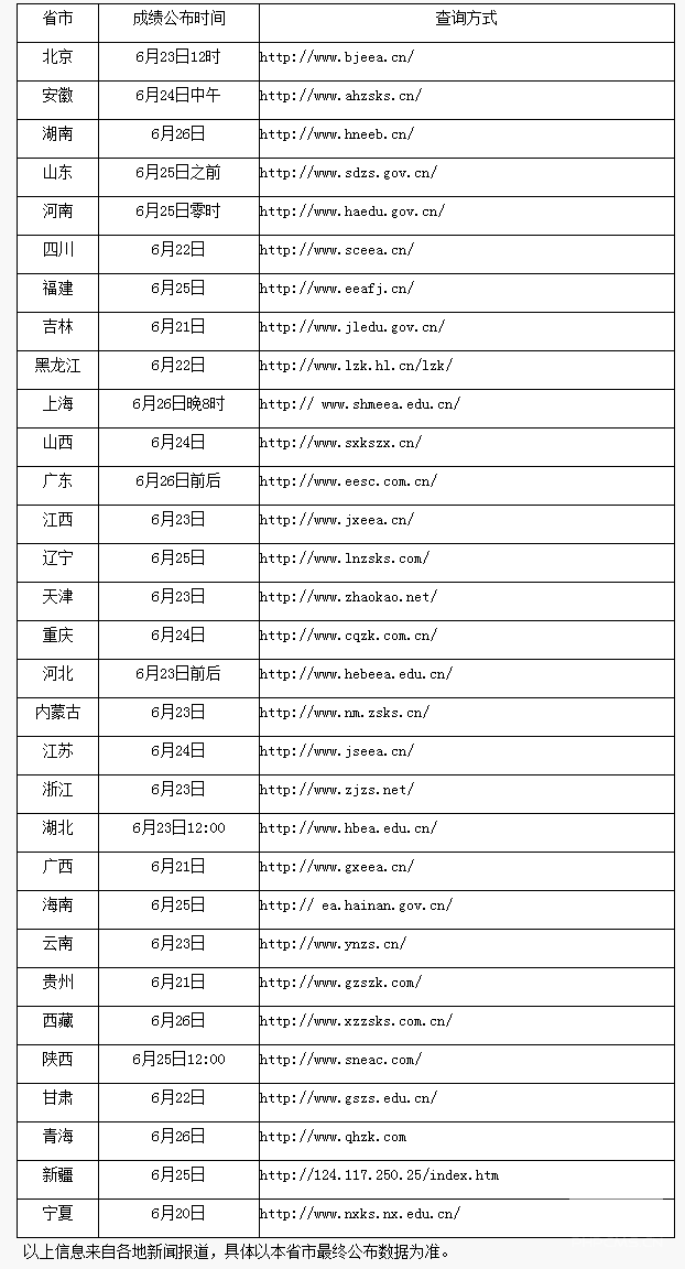 2014年全国各地高考刚刚结束,大家最关心的莫过于成绩什么时候出来。小编汇总了全国各省市高考成绩查询时间,大部分集中在6月下旬公布,以下供大家参考。(不断添加中,敬请关注!)