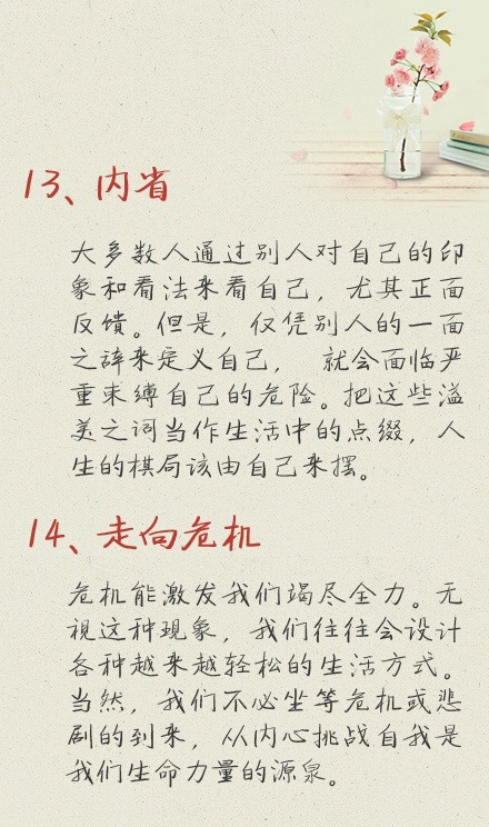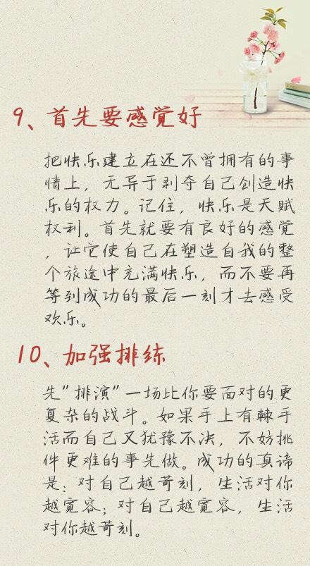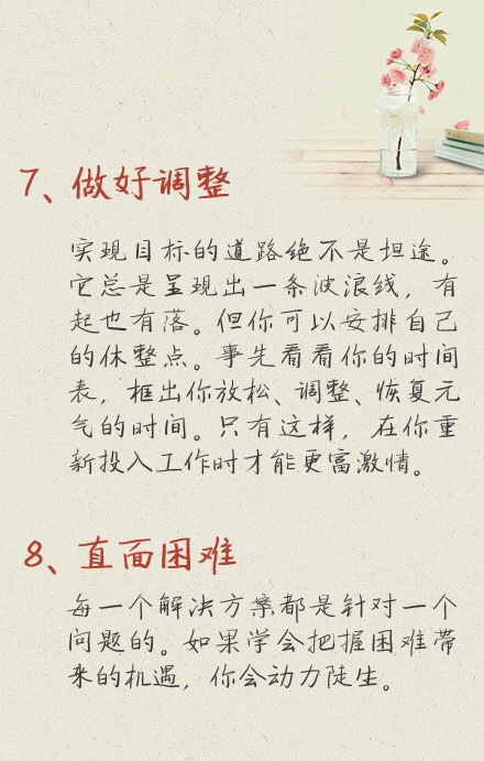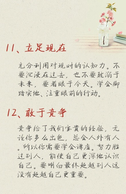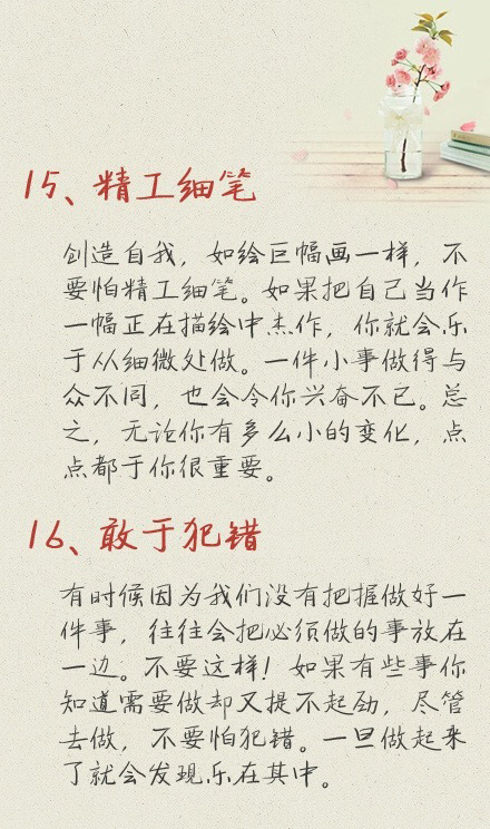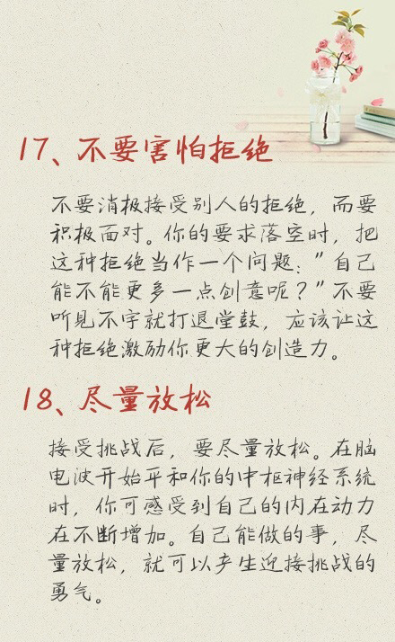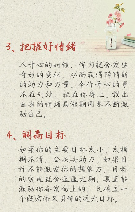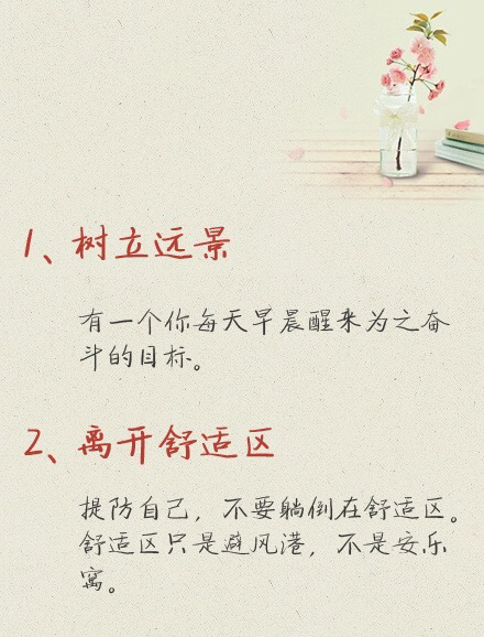 据说,成功者拥有9种共同的素质:①不抱怨,牢骚满腹只显无能;②不惧压力,很多成就常实现于逆境;③独处,给自己空间思考;④变化,以变应变才有出路;⑤自制;⑥自信;⑦学习;⑧专注;⑨理智。 想有所成就又找不到动力?小熊教育网在此与大家分享18个自我激励的方法,而下面要做的就是“改进”,为了想要的生活。 ![]() ![]() ![]() ![]() ![]() ![]() ![]() ![]() ![]() |