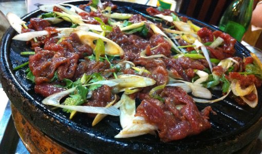 是由宋代民间食品“熬肝”和“炒肺”发展而来的北京小吃,将切好的熟肠段放入沸汤,放入蒜酱、葱花、姜末和口蘑汤,之后加入生猪肝片勾芡,最后撒上蒜泥,炒肝便做好了。汤汁晶莹透亮,猪肠肥滑软烂,肝嫩鲜香,醇厚味美。 ![]() (五)老北京烤肉