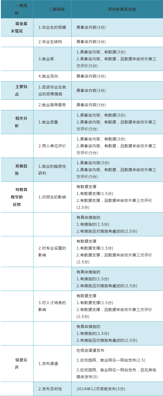 21世纪教育研究院日前发布《2014年“高校就业质量年度报告”发布评价排名》(以下简称《排名》)。《排名》显示,2014年度“就业质量年度报告”的水平相较上一年度有所提高,从总体得分方面看,2014年度报告的综合平均得分为60.2分(百分制,下同),相对于2013年的56.8分有所提高;从最高与最低的综合得分来看,本年的最高最低得分(81分、41.4分)较去年均有所提高(2013年度报告最高最低得分分别为72.4分与37.9分)。 今年1月,教育部直属高校陆续发布2014年毕业生就业年度报告。数据显示,75所直属高校中,74所高校本科毕业生就业率超过90%。21世纪教育研究院发布的这份排名,是对教育部直属高校2014年度“就业质量年度报告”的合规性做出评价。 《评价》表明,在所有的15项评价指标中,8项指标的合规得分比例较去年有所提高,5项指标与去年基本持平,2项指标较去年有所下降。在报告内容相关12小项的指标中,除“对招生的影响”以及“对专业设置的影响”两项小指标的合规得分比例在7成以下外(分别为54.1%与52.7%),其余指标合规性比例均高于7成。分开从内容完备性与公信力评价以及信息公开评价来看,得分也均有所上升:内容完备性与公信力评价的平均得分为58分,信息公开评价的平均得分为73.48分,去年两部分平均得分分别为55.4分与65.3分。 《评价》显示,该报告依据《教育部办公厅关于编制发布高校毕业生就业质量年度报告的通知》(教学厅2013年25号)以及《关于做好2014年高校毕业生就业质量年度报告编制发布工作的通知》 两份文件,对于报告内容方面的描述,共制定5大项、12小项评价内容,5大项评价内容为就业基本情况、主要特点、相关分析、发展趋势与对教育教学的反馈。在具体的12小项指标之中,包含对于公信力评价的指标,根据相关文件规定,“有条件的地方可以委托第三方评价”,因此,若年报内容中引用了来自校外第三方评价的数据,则具有更高的公信力。 对于报告发布方面的描述,制定第6大项评价内容:信息公开,该大项内包含3小项评价内容,主要评价报告发布与发布及时性是否合规。 此次评价的范围为75所教育部直属高校,但其中北京语言大学未参与排名。排名的计分方法为:某小项内容缺失得0分;满足评价标准中相应要求即可获得相应分数。内容评价满分为50分,包含完备性与公信力两个部分;信息公开评价满分为8分,共计满分为58分。 【附:评分标准】 根据《教育部办公厅关于编制发布高校毕业生就业质量年度报告的通知》(教学厅2013年25号)以及《关于做好2014年高校毕业生就业质量年度报告编制发布工作的通知》,制定如下评价方法。 ![]() 具体说明如下: 一、就业基本情况 1.毕业生的规模:至少有总毕业生数就可得3分; 2.毕业生结构:至少有分学历层次毕业生数、男女比例、各院系或专业毕业生数、分民族人群数等任一个数据,可得3分; 3.就业率:有全校的就业率得1分,有分专业就业率得1分,有就业率的统计时间节点得1分。如果数据来自第三方评价,就可得5分; 4.就业流向:有毕业生就业地域得1分,有行业流向得1分。另外,有其他方面的就业流向数据支撑可得1分,如升学率、自主创业比例、基层就业比例等。 二、主要特点 1.促进毕业生就业的政策措施:至少具备一条促进毕业生就业的政策措施,可得3分; 2.就业指导服务,至少具备一项就业指导服务,可得3分。 三、相关分析 1.就业质量:至少有全校总体的月收入、就业现状满意度(签约满意度)、专业相关度(专业对口)、离职率(违约率)等任一个指标和数据,可得1.5分;至少有分院系或分专业的月收入、就业现状满意度(签约满意度)、专业相关度(专业对口)、离职率(违约率)等任一个指标和数据,可得1.5分;如果数据来自校外第三方评价,就可得5分; 2.用人单位评价:只要有用人单位对毕业生的评价数据就可得3分,如果该数据来自校外第三方评价,就可得5分。 四、发展趋势 1.就业的趋势性研判:如果对趋势进行了研判,就可得3分;如果对趋势的研判中有来自校外第三方评价的就业指标数据,就可得5分。 五、对教学的反馈 1.对招生的影响:如果有说明就业对招生具体影响的数据,可得1.5分,如果数据来自校外第三方评价,就可得2.5分;有提出招生调整措施的,可得1.5分,如果对措施进行具体阐释的,可得2.5分;数据支撑、措施并不要求同时具备,若只有其中一项,得相应的分,若都有,分数累加。 2.对专业设置的影响:如果有说明就业对专业设置具体影响的数据,可得1.5分,如果数据来自校外第三方评价,就可得2.5分;有提出专业设置调整措施的,可得1.5分,如果对措施进行具体阐释的,可得2.5分;数据支撑、措施并不要求同时具备,若只有其中一项,得相应的分,若都有,分数累加。 3.对人才培养的影响:如果有说明就业对人才培养具体影响的数据,可得1.5分,如果数据来自校外第三方评价,就可得2.5分;有提出人才培养措施的,可得1.5分,如果对措施进行具体阐释的,可得2.5分;数据支撑、措施并不要求同时具备,若只有其中一项,得相应的分,若都有,分数累加。 六、信息公开 1.发布渠道:如果按照教育部要求,至少在校园网和就业网任一网站上发布的,可得2.5分;如果满足前者,且在任一其他媒体上发布的,可得5分(全国大学生就业公共服务立体化平台等教育部主办媒体存在汇总发布情况,因此不计入评分;如果校方微博、微信或通过普通网页