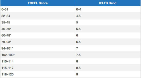 根据新托福考试成绩研究报告,美国教育考试服务中心官方收集了1153名同时参加过托福和雅思考试的考生成绩数据,并研制出托福雅思分数转化器,水平方向移动下方图示中的蓝色尺标即可获取托福分数(0-120分),所对应的雅思分数(0-9分)。注:大部分的1153名研究对象在托福和雅思两项考试中皆拿到了中等及中等偏上的分数。 ![]() 托福雅思分数对比表格 如图所示:雅思7.5对应的托福成绩是102-109;雅思8分对应托福110-114; 美国教育考试服务中心希望开发这个转换器可以帮助学生做出明智的选校决定,需要申请海外高校的同学们可以参考官方给出的托福雅思分数换算表,根据自己特殊的需求,选择适合的考试。 ![]() 托福与雅思分数转化表