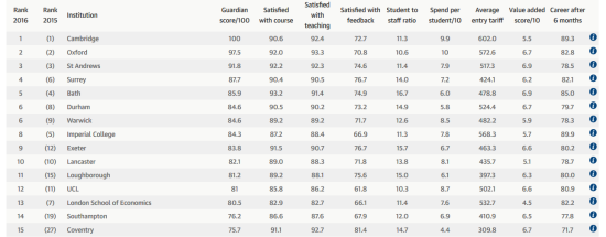 一年一度的《卫报》英国大学排名新鲜出炉。纵观整个排名,英国剑桥大学连续五年蝉联冠军,牛津依旧第二,圣安依然稳妥占领前三甲。而悲剧的UCL不受卫报万千宠爱,一退再退,甚至LSE被挤出TOP10。低调的萨里竟也悄悄的爬到巴斯头上,有了新欢就忘了就爱。令人感到惊喜的是,昔日20开外的考文垂脱颖而出,一跃而跨10多名。本次排名槽点太多,请慢慢研究。 与去年的排名相比,今年排名大概都三点不同: 一、与去年相比,英国各大学花在学生身上费用比重由原先的15%降至10%,其余5%分别分布在就业前景,附加分数,录取分数,和师生比例上。 二、附加分数计算方式有所改变,在学生申请学校时,会被分为一等和二等一 学位。随后,根据不同学位,学生与学校间的互相选择也会有所不同,一些门槛低的大学反而会给学生较高的分数。 三、学校录取分数较之前相比,有一个有所改变的规定,年龄较大的学生(入学时年龄在21岁或以上)在进入学校院系时,不再需要计算平均分。 ![]() ![]() ![]() ![]() ![]() 2016年《卫报》最新英国大学排名出炉 《卫报》是有着百年历史的老牌报纸。上世纪80年代后期在国际著名设计大师大卫·赫尔曼的引领下改革创新,寻求着自己的发展之路。此后,《卫报》建立了自己的大学排名评估方法——每年按照学生对大学的教学、科研实力、与学生与教职员素质这些方面进行评价打分,然后生成自己的英国大学排名榜。《卫报》的宗旨就是帮助那些打算上大学的英国学生挑选科目。 《卫报》的排名相对主观,但所有数据真实可靠,有一定权威性。可供留学[微博]生们选校时的参考。 (来源:卫报 编辑:申书瑜) |