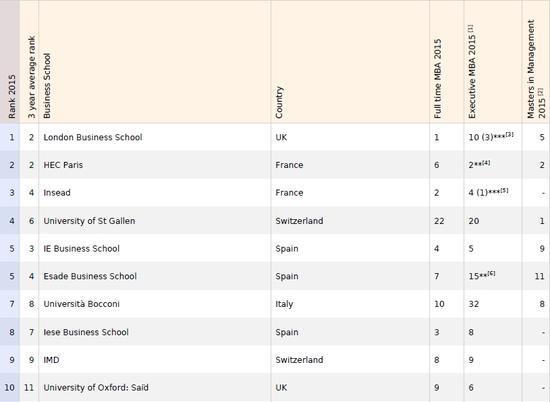 伦敦时间12月7日,《金融时报》(《Financial Times》)发布了2015年欧洲商学院排行榜,该榜单被誉为“欧洲商学院竞争力风向标”,在欧洲范围内具有广泛认可度。 来自英、法、瑞、意、西五国的商校占据了榜单的前十名,其中,英国占据2席,法国2席,瑞士2席,西班牙3席,意大利1席。伦敦商学院排名榜首,法国HEC和INSEAD分列二三位,排在第四到第十位的学校依次是:瑞士圣加伦大学、西班牙的IE商学院和ESADE商学院、意大利的博科尼大学、西班牙IESE商学院、瑞士洛桑国际管理发展学院(IMD)、英国的牛津大学赛德商学院。 ![]() 榜单前十名 值得一提的是,在榜单全部的85所院校之中,法国商学院入榜22所,英国18所,是进榜院校最多的国家;而在榜单前30的排名中,英法两国的院校也占据了半数(法国8所,英国7所),足见两国的商科教育在欧洲举足轻重的地位及良好的声誉。 |