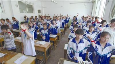 ![]() 距离高考还有一天,甘肃会宁县第一中学的学生手系红色希望丝带为高考加油。