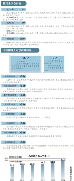 ![]() 全国高中课程将全面修订 发布会上,教育部高校学生司副司长王辉介绍了考试招生制度改革的情况。2014年9月,国务院发布了《关于深化考试招生制度改革的实施意见》,标志着我国新一轮考试招生制度改革启动。 王辉表示,目前除上海、浙江已发布方案外,包括北京在内的其余29省份均已形成考试招生制度改革实施方案及相关配套文件,各地方案基本成熟,相关备案工作也正抓紧推进。 为与新的高考招生制度改革相协调,教育部基础教育二司副司长申继亮表示,我国将全面修订高中课程,从课程方案的设置,到每一门课程的标准,接下来对每科的教材,都要全面修订,加大高中课程的选择性,满足改革后高考“选考”的要求。 2018年地方性加分项减至35个 一直以来,高考加分一直备受关注,王辉表示,减少和规范高考加分实现了“大幅减少、严格控制”的目标,“全国性高考加分项目今年已按要求全部调减到位,地方性加分项目从2014年的95个减少到2018年的35个”,减幅达63%。 去年12月,教育部、国家民委、公安部等五部门印发了《关于进一步减少和规范高考加分项目和分值的意见》,规定自今年1月1日起,将取消省级优秀学生、思想政治品德突出事迹者、奥赛获奖者、科技类竞赛获奖者、体育特长生等5项全国性加分,地方性加分中的体育、艺术、科技、三好学生、优秀学生干部等项目也取消。 《意见》还要求,各省(区、市)要进一步大幅减少其他地方性高考加分项目。教育部部长袁贵仁在今年3月也曾表示,今年全国加分政策鼓励类的全部取消,只保留一些扶持性政策,地方性加分减少63%。 据之前媒体报道,2014年以前的地方性加分项目有124项,到2014年减少近三分之一。目前,辽宁等13个省份取消了所有地方性加分项目。近年来,全国每年享受地方性加分的考生约3万名。 明年将有26省份使用全国卷 近两年来,使用全国卷的省份数不断增加。据王辉介绍,安徽、福建等8省份已申请2016年起使用全国卷,全国卷使用省份从2014年的15个增至2016年的26个,增加使用全国卷省份的任务基本完成。 根据2014年9月公布的《国务院关于深化考试招生制度改革的实施意见》中,深化高考考试内容是改革的重要举措。在今年3月份,教育部部长袁贵仁曾明确表示,要扩大高考统一命题试卷地区范围,当时透露的增加范围是,2015年增加3个,2016年再增加7个。 据之前媒体报道,自1987年教育部批准上海实行“3+1”高考改革方案并实施自主命题后,2002年北京市也获得了语、数、外3科的单独命题权。至此以后,省份陆续增加,到2011年,全国已有18个省份单独命题,涉及考生占全国总数的65%。 ■ 解读 专家 全国卷推广应与录取制度改革并行 “全国卷推开并不是新出的政策”,昨日,21世纪教育研究院副院长熊丙奇说,去年发布的高考改革意见中,就已明确要求要扩大全国卷适用范围,意在改变各个省份出卷质量参差不齐的情况,并规避可能出现的泄题漏题风险问题,“推广全国卷有助于提高试卷质量,也得到了网友肯定。” 但熊丙奇认为,推广全国卷并不意味着高考变得更加公平,因为在不改变现有录取制度前提下,即使有更多省份使用全国卷,最终录取时依然是本省学生在省内竞争,并非全国统一录取,“依然是按计划分省录取”。 而在此前,也曾有过将高考试题命制权下放到各省份的政策,“也有人说是重大改革”,熊丙奇说,但最终考虑到各地考试安全、泄题漏题等考试风险问题,最终还是回到了如今的推广全国卷。 但若要推进高考公平,同时还应推进的是录取制度的改革,“建议对使用全国卷的省份,由重点大学统一录取”,他建议,应向考生在任何地方都能报考,由大学结合平时成绩、高考成绩、面试成绩和中学评价进行统一录取,打破行政疆域界限,不再按省内排名录取学生,会更有利于促进高考改革和公平。 ■ 落地 北京 2015年高考有13类人可享受加分 今年3月,北京市教委发布的高招工作方案中,针对高考加分项目、录取方式等进行了改变,北京市高考改革方案或于近期公布。 在2015年北京高考中,针对加分项目进行了较大调整,仅13类人可享受加分,体育特长生、奥赛、思想品德优秀事迹等全国性加分项目被取消,2015年1月1日前获得相应称号的可增加5分投档。 市教委相关负责人曾表示,取消上述加分项目后,北京市将继续通过4种方式鼓励和体现学生兴趣特长发展,分别为:创造条件,积极鼓励每一个中学生积极参加日常校园“阳光体育”、艺术、科技创新及社会实践等活动;将考生的体育、艺术、学科等特长如实记入学生综合素质档案或考生档案,供高校录取时参考;鼓励具有体育、艺术特长的学生报考高校高水平运动队、高校艺术团,或报考相关体育、艺术类专业;将考生的相关学科特长和创新潜质,作为自主招生试点高校优先给予初审通过的条件。(记者 沙璐 黄颖) |