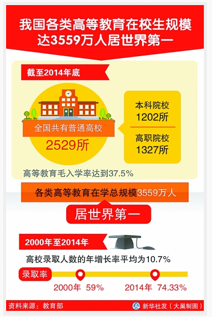 ![]() 今年,全国性高考加分项目已按要求全部调减到位,地方性加分项目从2014年的95个减少到2018年的35个,减幅63%。 教育部高校学生司副司长王辉介绍,从总体情况看,一些原来受制于高考制度的基础教育改革开始“破冰”,如扩大学生的选择权、推进选课走班、关注学生成长过程等;一些更加多样化的科学选材举措开始“破土”,如高校对高中学业水平考试提出科目要求、更多的高校招生录取探索使用综合素质档案等。 下一步,教育部将指导各地完善考试招生制度改革实施方案和相关配套文件,由点到面逐步扩大高考综合改革试点。预计2016年部分省份将先行启动改革进程;2017年,大部分省份将进入改革行列。 教育部基础教育二司副司长申继亮透露,与高考改革相适应,教育部将全面修订高中课程,并大力推进教学模式的改革,稳步开展“选课走班”制度。 高考制度改革,为学生走进大学厘清了道路。而如何更好地实现学有所用,一些院校也开始尝试转型。 从2000年至2014年,中国高考报名人数从375万人增至939万人,全国高校录取人数从220万人增至697万人,录取率由原来的59%提高到了74%。 此外,大学生人数猛增,但就业质量良莠不齐,最近几年大批毕业生遭遇就业难题,这迫使部分本科院校寻求转型。2013年6月,全国三十多所院校发起成立了“中国应用技术大学联盟”。截至2014年4月,有178所地方高校加入,致力于地方本科高校转型和应用技术大学建设之路的探索。 |
