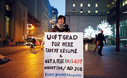 据加拿大《星岛日报》援引《星报》报道,华裔多伦多大学毕业生严心怡(音译Xingyi Yan),为进军心仪的推广及广告界,不惜在寒冬的街头站7日举牌兼派履历表毛遂自荐,过程中虽然饱受冷嘲热讽,但终获全球四大广告集团旗下公司招聘。 ![]() 严心怡上月站在多市街头,拿着纸板推销自己严心怡上月站在多市街头,拿着纸板推销自己