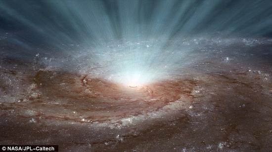 ![]() 艺术示意图:星系NGC 3783。观测显示这个星系核心的超大质量黑洞正向外喷射强大的星系风