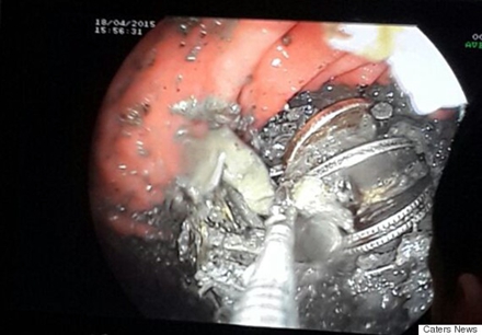 流言:都说“人吃五谷杂粮,哪有不生病的”,乱吃东西真的会损害人体健康……如果吃的根本不是食物,而是硬币、石子、瓶盖这些乱七八糟的东西,又会不会吃死人呢? 真相: 为啥要吃? 不止人类会吞食异物,猪、牛、羊等动物也可能在吃草时将异物囫囵吞下。当然,人类比动物更加聪明,成年人误吞的可能性很小,更多的是故意将其吞下。 究其动机,一种是此人出于某种心理或者精神上的问题,虽然明知道是异物,但却不认为其有害,甚至觉得有食欲,或者是明知有危害还是忍不住想要吃下去。 这种主观上乐意吞食异物的行为并不是什么稀罕事,甚至有一个专门的名字:异食癖,从少年儿童到成年人都有发生,其中有的人是吞墙皮,有的人是吞头发,有的是吞石子,甚至还曾出过一个更猛的:喜欢喝汽油,给人感觉或许是汽车人转世…… 比如,今年4月,34岁的印度农民拉贾帕·辛格(Rajpal Singh)因为精神抑郁,经常有事没事的喝着牛奶吞吃异物。最终,医生通过两次手术,在其胃肠道中取出了140枚硬币、150多根铁钉,以及一堆螺丝、螺母、电池之类的奇怪东西,场面相当骇人。 ![]() 从食道镜中可以看到印度患者胃肠道中的异物 而另一种动机,则是行为人心理正常,非常不愿意吞服这些异物,但为了造成自己的身体伤害,而故意强迫自己吞下去。理论上说,谁都不会跟自己过不去,但在涉及到司法程序时,这种事情就时有发生了。 比如,一篇文章曾经提到,在1999年~2002年期间,杭州某戒毒所在强制收容的吸毒成瘾者中,居然发生过272例吞食异物的病例,其目的均是为了逃避强制收容戒毒[1]。无独有偶,天津某医院在十年时间中,也接诊了六百多例吞食异物的病例,这些人有的是在被抓捕的现场,有的则是在看守所甚至监狱中吞食异物[2],异物的种类从刀片、缝衣针、硬币、门把手到打火机、剪刀什么都有,让医生也觉得不可思议。 一句话,吞食异物,还真不是什么稀罕事。 会死人吗? 可能读者最关心的一个问题,就是这些人在吞食异物之后会出现什么样的状况,会不会死人呢? 这个问题,就得分别讨论了。 经过千万年的进化过程,我们的肠胃功能恐怕已经比祖先弱了很多,生的、冷的都承受不住了。然而,我们的消化道系统还是有一定的“容错能力”的,对于完全无法消化的异物,如果其尺寸不是太大,消化系统都会尽力将其夹杂在粪便排出体外,从而降低损伤。 但是,如果吞食的异物是有棱有角的尖锐物体,则有相当可能会刺伤、划伤食道、胃肠道的内壁。这种伤害可能没有严重后果,几天就自愈了;但也完全可能一发不可收拾。比如,曾有人吞服了缝衣针,结果针将肠壁戳破而引发了腹膜炎——这种疾病如果不立即治疗,在很短时间内就可能导致败血症而致死。 另外,如果吞食的异物很多很重(比如上面说的那个拉贾帕),这些异物就会彼此堆积在一起,很难从消化道中排出了。这样,就可能导致胃、肠道因为承受这些异物的重量而出现机械损伤,也可能导致肠梗阻,但通常都不会立即致死。清朝曾有个大臣赵舒翘被慈溪太后赐自尽,吞了一碗碎金块居然跟没事人一样;监斩的岑春煊实在不耐烦了,干脆命人将其捂死,否则能撑几天也未可知。 总之,通常而言,吞服少量的、不尖锐的异物,是不会有生命危险的;然而,这种做法的危险性依然存在且无法预判,所以没事干真不能乱吃,哪怕是为了逃避司法机关的制裁也犯不着这么玩。 如何治疗? 假设某人已经吞食了异物,医生又会如何处理呢? 通常而言,如果确切地知道患者吞食的异物体积不大、数量不多,则医生会通过X光等手段确认,然后帮助患者自行将异物通过大便排出体外。常用的治疗手段,包括让患者吞服大量韭菜(缠绕、包裹住异物,降低其尖锐部分伤害胃肠道的风险)、灌服石蜡油(一种无毒无害的液体,目的是润滑胃肠道内壁,利于异物通过消化道的各个狭窄处)等等。 如果异物较大较多,估计是无法排出体外了,则医生还会使用食道镜来取出异物。这种医疗器械有点像是胃镜,软管前端有一个摄像头和照明LED,塞进患者口中之后,医生就可以看到胃肠道中的情况了;一旦发现异物,软管上还有一对小钳子,医生可以在体外张开、合拢钳子,把异物给“夹”出来。 如果上述两种方案都失败了,最后一招就是外科手术,打开患者的腹腔和胃肠道,从中取出异物。当然,既然是手术,风险肯定比上述两种方案都大,恢复起来也需要更长的时间。 从有限的文献报道来看,手术失败、患者死亡的概率很低,大致在千分之几左右;而通过食道镜等器械将异物取出的成功率高达九成以上[1][3],总体而言,治疗的情况还是比较乐观的。 但是,这绝对不是在说,这种行为就没有危险。如果发现较晚,或者已经发生了腹腔感染,医生也可能无力回天。 应对策略 对于异食癖患者而言,吞食异物是有一个过程的,家属(特别是未成年人的监护人)完全可能及时发现、及时制止,必要时寻求心理医生的干预。 而对于那些通过吞食异物来自残、自伤,以逃避司法机关追究的嫌疑人、犯人而言,司法机关采取的措施则是严防死守,尽可能不给他们这种机会。比如,在抓捕现场,一旦发现嫌疑人企图吞食异物,则立即将其控制住并送医;在看守所、监狱等处,则要做到尽可能不出现合适大小的异物(比如剪刀、瓶盖这种能够吞下但又不容易排出体外的东西),降低出现事故的风险。 一句话,异物不能乱吃,吃了