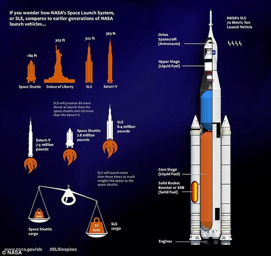![]() ![]() 在推进力方面,“太空发射系统”比“土星五号”火箭强大得多。未来,更大版本的“太空发射系统”在体积方面也要比“土星五号”大得多。