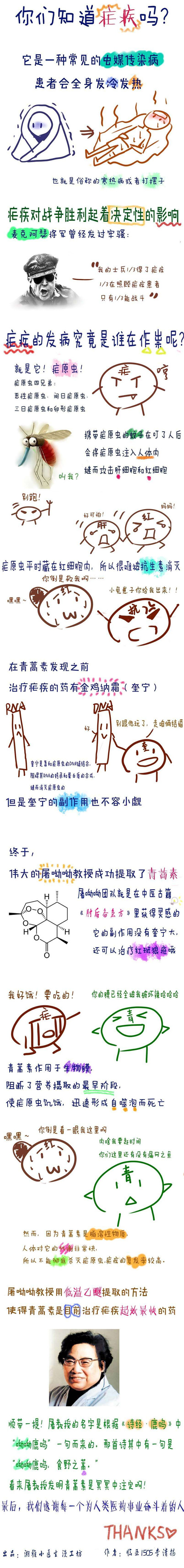 ![]() 10月5日,瑞典卡罗琳医学院在斯德哥尔摩宣布,85岁的中国女科学家屠呦呦和一名日本科学家及一名爱尔兰科学家分享2015年诺贝尔生理学或医学奖,以表彰他们在抗疟疾药物研究方面的贡献。10月7日,两幅关于屠呦呦的漫画在网上流传开来,利用可爱的漫画形式对屠呦呦、疟疾以及青蒿素进行了通俗易懂的阐释。 这两幅漫画分别名为《漫话医聊丨“青蒿素大师”屠呦呦新技能get√》、《漫话医聊丨一张图读懂呦呦抗疟记》,率先在“湖南医聊”微信公众号上首发,便引起众多网友的点赞热捧和转发。 殷悦在电话中告诉记者,屠呦呦获奖消息一出来,微信朋友圈和QQ空间就被身边的同学刷屏了,但他发现自己身边很多朋友,尤其是非医学生的朋友受专业知识的限制,对屠呦呦在疟疾方面做出的巨大贡献还不能完全深刻领会,“作为一名医学生,平时又喜欢画画,于是萌发出用绘画方式为大家更科学地解读屠呦呦获诺奖的想法”。 据介绍,湘雅医学院对绘画感兴趣的医学生于一年前自发组织成立了“漫画工作坊”,通过漫画的形式,向社会传播医学科普知识。 现任坊主殷悦向漫工坊成员提出解读屠呦呦获得诺奖的想法后,很快得到了李清扬的响应。他们利用国庆黄金周的假期,第一时间推出了这两幅漫画。 “画漫画最难的其实是文字的内容,怎样把趣味性和科学性有机结合。”对于创作过程,李清扬说,“作为一名刚入学的大一新生还没有学习医学专业知识,因此在画漫画前,花了很多时间在网上搜集了大量的资料,还翻看了相关专业书籍。”(记者 刘柱 通讯员 李玲 张秀瑞) |