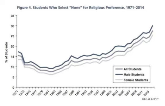 作者姜之端同为21世纪进入高校的一代,十年前的美国大学生和今天美国大学生表现有什么不同?近日有美国媒体从多个角度梳理10年间,美国大学和大学生的不同,从中可以看出美国从教育政策到社会文化风貌的多种变迁。 《赫芬顿邮报》创刊10年来发表了许多关于教育和学习的文章。去年,该报纸总结了从2005年来流行文化是如何改变我们的校园的;今年,他们对大学生这个群体做了总结,从很多突出的问题上,我们可以看到这个时代发展的轨迹如何印在青年一代的身上。 下面我们简要来看一下10年来美国大学生的变化。 变化一:更少的美国大学生信仰宗教了 加州大学洛杉矶分校的Cooperative Institutional Research项目年鉴表明,无宗教信仰的学生比例逐渐增多,甚至宗教学校也有此趋势。这个数据来源自超过200所高校的150,000名全日制大学新生的调查。 2014年,大学新生里选择“无宗教信仰”的人数比例达到受访学生人数1/4,2005年时该比例仅1/6。于此同时,天主教学校里没有宗教信仰的学生比例也从10年前的10.6%上升到14.9%。在其他宗教学校里,这一比例几乎翻倍,达到17.4%。 ![]() 更少的美国大学生信仰宗教了 变化二:学生们更有压力、更沮丧,也更孤独 大一新生认为“偶尔或者经常感到压力过大”的学生比例从2005年的24%跃升到34%。2014年只有一半的大学新生认为自己在情绪健康方面“达到一般水平或更好一点”,延续了从1985年的63%到2005年54%的下降趋势。 2011年美国高校协会咨询中心主席DeniseHayes认为,学生持续下滑的情绪健康情况和财务压力有关。“大学学费比以前高了,所以学生感到自己的学习表现必须要回报父母的投入”,他说,“还有一种观点我也很赞成,学生成绩越好找到工作的几率也越大。” 加州大学洛杉矶分校的项目主管Kevin Eagan告诉赫芬顿邮报的记者,他认为今年学生们情绪健康情况的恶化与他们社交时间有关。Eagan说到,那些感到压力大的学生,“因为他们不让自己从压力中解脱出来”。该学校里去年参与调查的学生说,每周在社交活动中花费16(及以上)小时的学生几乎下降了一半,比例为18%。 ![]() 学生们更有压力、更沮丧,也更孤独 变化三:学校开始提供戒毒服务 大学环境为获得毒品提供了更多路径。根据非营利组织“Transforming Youth Recovery”的数据,参与校园无毒品康复项目的高校在10年里的10所增加到2015年的135所,并且大多数学校都是在最近5年里参加的。 高校中的类似项目和服务旨在帮助有自助意识的学生,让他们从集体的关照下恢复过来。Transforming Youth Recovery说,截至2014年6月,他们已经“提供工具包、助理人员和590,000美元的投入给59所高校,希望能够调动起现有的人力物力来帮助学生拜托毒品依赖。 变化四:学校开始处理校园性暴力行为 从2013年起,对于学校不重视性暴力的批评日趋高涨,随之而来的学生抗议活动增多,联邦政府对于该问题也更加重视。国家教育部公民权利办公室已经对110所高校展开了120起调查,到今5月7日,调查数量已经比上一年增加了55件。10年前,高校里性侵犯的情况也不少,但是国家没有在此问题上有过多表态。 教育部的一位官员说,“直到2009年,政府都没有将性暴力作为一种特殊的性骚扰行为”,当时奥巴马开始就任美国总统。教育部的数据显示,2014年对于人权办公室的投诉达到9,989个,几乎是2005年5,533个的两倍。2013年和2014年中,办公室收到的投诉里有854件是关于性暴力、性骚扰和性别歧视的。 “我希望我们不要忘记那段黑暗的时光,那个时候孩子们经常被强暴,性侵犯似乎成为这个年龄段的必经”教育部人权办公室助理秘书 Catherine Lhamon在接受我们的采访时说到,“我非常希望我的两个女儿,当他们10年后去上大学,能够注重自己的精神生活,而不是注重肉体的享乐。” 随着高校里强奸受害者的增加,被指控的学生也开始用法律诉讼回击伤害,他们声称自己遭受了错误的指控或者拒绝走正常处理程序。人权办公室在至少两起调查里引起公愤。“我们必须告诫学校,对待两方学生都应该公平,包括像对原告一样尊重被告的解释权” Lhamon又说到,“我希望双方都没有隐瞒事实,这一点很重要。” 有一些学生认为学校在对施暴学生上台宽松了,有的学校甚至允许他们换一个院系就好。反校园性侵犯的学生希望许学校能够重视这个问题,对于此问题的改革将使学校更富有责任感,也能提升刑事司法体系。 变化五:大学招生和就业市场息息相关 大学新生招生数量每年都在增加,但是高中毕业升入大学的人数却没有增加。 高中毕业后直接升学进入高校的学生比例从1993年起就在61%到69%之间波动。但是近几年,这一比例却有所下降。有专家猜测,高等教育就读人数的减少可能和就业市场的发展有关。 根据美国教育部的数据,拉丁裔和西班牙裔学生占据了高校招生学生中最大的部分,从2005年的1千8百万增加到2012年的2千9百万。这个趋势10年来非常稳定,从大衰退时期开始就有明显增长。 变化六:关于上大学是否值得的争论 在过去10年里,因为读书带来的债务使得“上大学是否值得”这个话题倍受关注。 亿万富翁Peter Thiel投资了一个泰尔奖学金计划,此项目给小于20岁的学生提供资金发起创业项目。政府官员,特别是共和党人,曾试图让学校展示其学生已经具备就业能力,或者让学生不去选人文科学这样拿不到高工资的学科。 奥巴