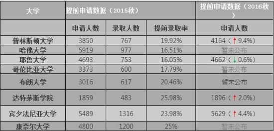 在经历了一轮紧张的提前申请之后,不少学生已经开始边等待提前申请的结果边做常规轮次的申请准备了。一般情况下,常青藤学校的录取将在12月出结果。不过到目前为止,已经有一部分常青藤学校公布了2016年申请季提前申请的学生人数。 ![]() 资料图 从上表中可以看出目前普林斯顿大学相较于去年的人数增幅是最大的。共有4164名学生提前申请了普林斯顿大学,这一数字相较于去年增长了9.4%。达特茅斯大学和宾夕法尼亚大学的也有不同程度的增幅,与之相反的是耶鲁大学,提前申请人数比去年下降了0.6%。 |
