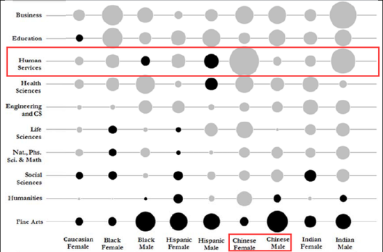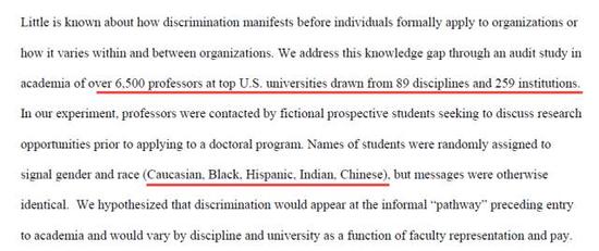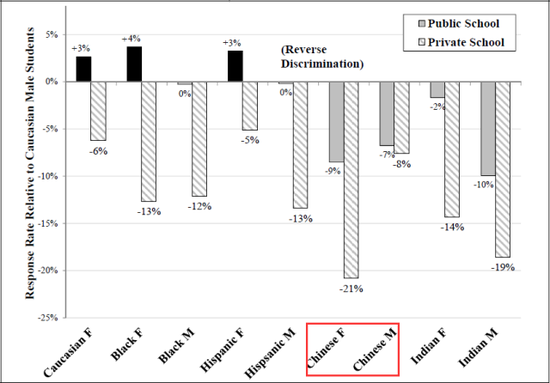 关于常青藤对亚裔的歧视,大家想必也多有耳闻,前一阵子64个亚裔团体一起状告哈佛这件事闹得是血雨腥风,把包括哈佛在内的多个常青藤高校都拉着一起躺了枪。 ![]() 这里的Asian并不是特指中国人,而是整个亚裔,常青藤对亚裔入学率的控制也是由来已久,这里面有很多复杂的美国国情、种族保护主义、少数族裔纠纷、平等权利之类的问题,在这里留学君先不展开细讲。 ![]() 从这张数据图上我们就可以看出来,这些知名美国大学里,除了加州理工以外,其他学校明显在“维稳”,普林斯顿和达特茅斯更是低的要命。华裔留学生逐年增多的情况下,录取率如此“平稳”,其中的人为因素可想而知。 这其中的成因先按下不表,我们放大一下细节,只看针对中国人的问题。 美国的SSRN做了一个叫做“What Happens Before?”的实验,研究人员将一封学生口吻的信件无差别发送给了6500多名美国大学的教授,覆盖了259个学术机构(其中很多顶尖大学)和89个专业,信件内容大体上都是套磁申请博士,所有信件只有学生署名存在区别,而通过署名,该教授可以很容易的判断出该学生来自什么族裔,反馈回来的实验数据将用于分析美国大学的教授们对学生的族裔身份是否存在选择性。 实验人员设定了五个学生身份:白人、黑人、西班牙裔、印度裔以及华裔(Chinese)。 ![]() 通过返回的数据,实验人员做了加权统计计算,当然,基于实验样本有限,以及考虑到个体特殊情况等造成的误差,我们暂不将下面数据定义为“表现了歧视”,姑且称之为“排斥”,大家需要辩证的看待问题。 商科专业排斥少数族裔最明显 ![]() 这个数据图是这样的,左侧是除了白人男性以外的学生身份所获得的回复(也就是女性和少数族裔),右侧则是白人男性所获得的超过其他学生的回复,以商科来说,就是其他学生收到62%的回复,而白人男性获得了62%+20%=82%的回复。 所以如此一排列就很容易发现,白人男性在商科专业上获得机会的概率比女性和其他族裔大很多,相反人文学科白人男性和其他学生只相差1%,可见人文学科不太在意学生族裔。而最后一条的艺术专业,却成了反向歧视——白人男性收到74%的回复,而其他学生收到了74%+16%=90%的回复率。 留学君暗自猜测一下,这无非是因为艺术是无国界的,对于艺术专业来说,来自多元文化反而更有利于学习的缘故,反之比较实际的商科就不太愿意和其他人分享了。 公共事业专业排斥华裔男性 ![]() 这张图,言简意赅的解释一下,就是说,灰色圈是正向歧视,黑色圈则是反向歧视,灰色圈越大,说明该族裔/性别学生所受歧视越严重。我们可以看到,除了艺术专业(全是黑圈的那一行)格外善待少数族裔以外,其他专业领域里,各族裔的学生多少还能拿出一个黑圈,华裔男生在人文学科勉强拿到一个小黑圈,而华裔女生一片灰色,没有任何艺术之外的专业对华裔女生有较高的关注度。另外,华裔男生在公共事业专业碰到的是所有数据里最大的钉子。 华裔女生受私立大学排斥严重 ![]() 最后,各族裔对比白人男性的歧视数值中,最惨烈的就是华裔女性,上图条纹柱表示私立大学,实色柱表示公立大学,我们可以明显看到,美国私立大学对华裔女性的排斥程度非常之高,公立大学也是不甘其后的样子。华裔男性相对好一些,只是在公立大学的部分遭到了比较明显的排斥。 美国大学对亚裔、华裔的排斥心理其实根本不是秘密,从某种意义上说,亚裔已经不能算是美国的“少数族裔”了,以中国、日本为代表的精英亚裔越来越多,让美国产生危机感和种族保护主义情绪是必然的结果。 而美国为什么敢格外照顾“亚裔”,这里的原因非常的多,暂时抛开对美国的指责,留学君私以为,最重要的原因之一在于在美华裔大部分都不关心美国政治,中国留学生也很少发自真心的融入美国文化。 举最简单的一个例子来说,很少有留学生毕业后有意识的回报自己留学的母校,美国名校大多是私立大学,经济来源里有不少来自校友捐赠,而中国学生很少有“给学校捐款的概念”。诚然,这是我们的文化差异导致的,但这确确实实从某些角度上降低了美国私立大学对中国学生的录取欲望。在加上美国本地的华裔们对为自己争取权利这件事一向有点不走心,被“控制人数”的时候成为头一个被下手的族裔也就不那么奇怪了。 本文的数据当然并不能直接得出什么定论,但留学君认为这也会反应出一些美国留学的现状和中国留学生要面对的困难,为了能让中国人更好的走向国际社会,我们要调整和改变的事情还有很多,要奋斗和争取的事情也还有很多,与君共勉。 |