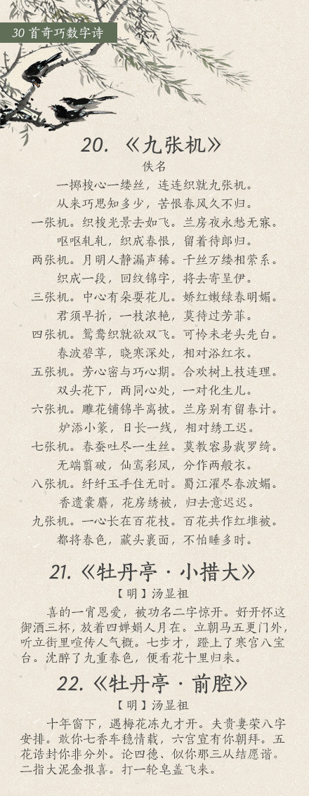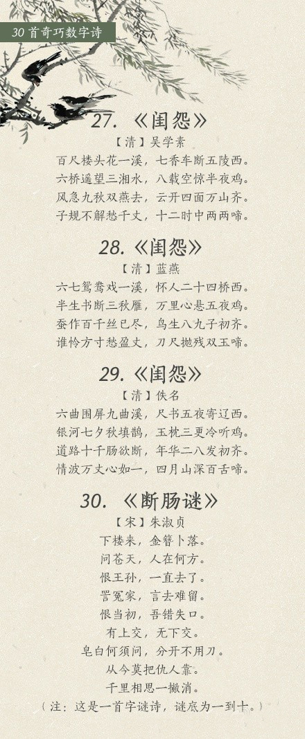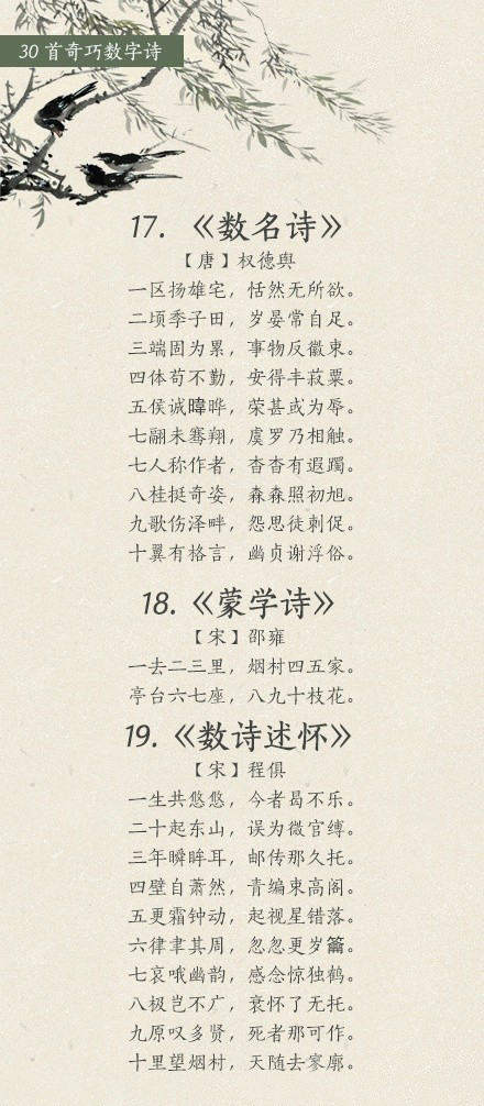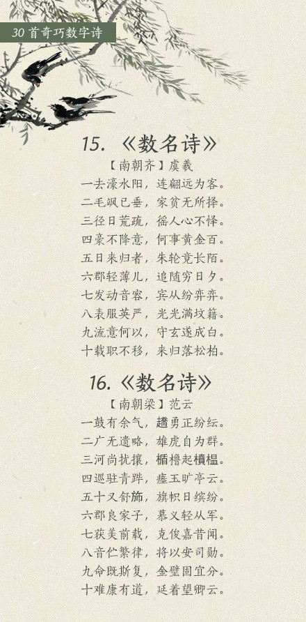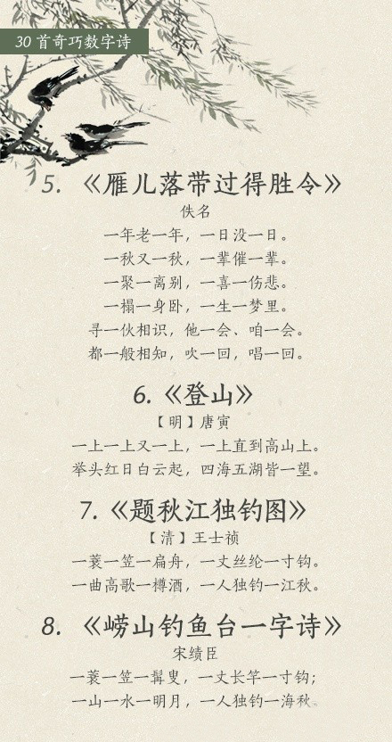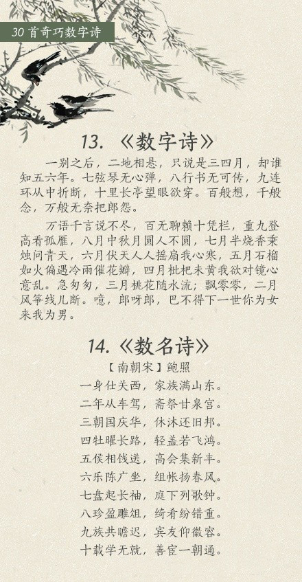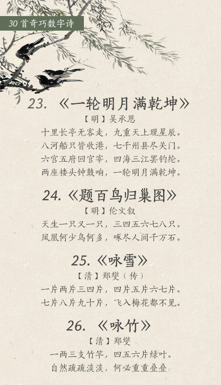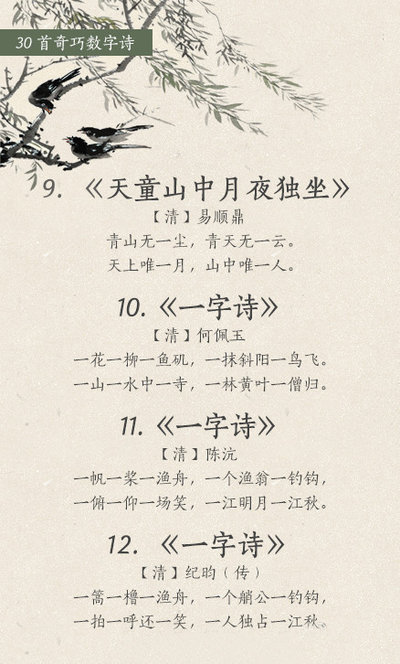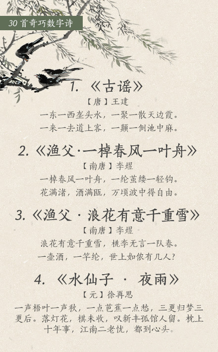 “一去二三里,烟村四五家。亭台六七座,八九十枝花。”我国古代的数字诗精巧有趣,才情纵逸。从一到十、从百到千的数字诗有一种整齐的建筑美,一字诗则错落有致,如同白描,极具诗情画意。30首奇巧数字诗,当数字遇上诗词,看它如何含情带意,摇曳生姿↓