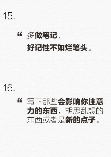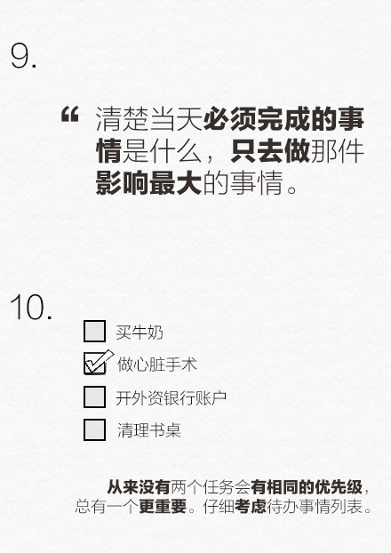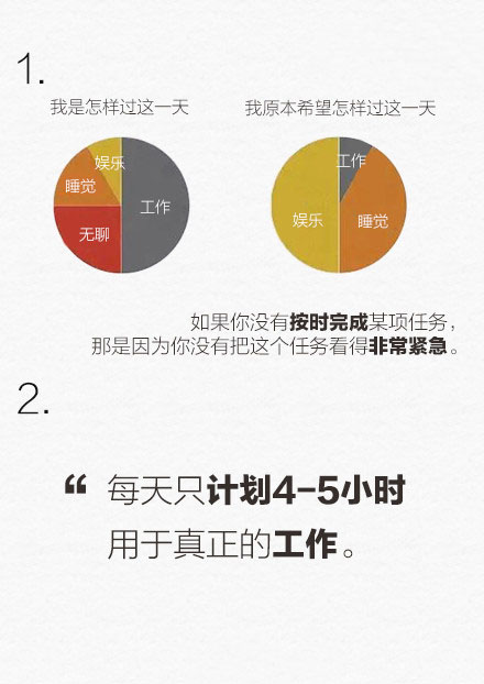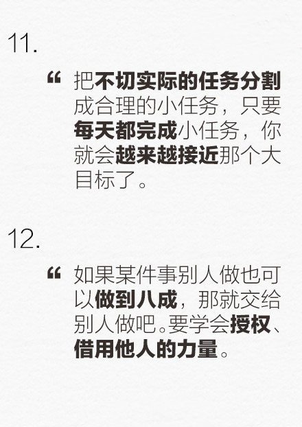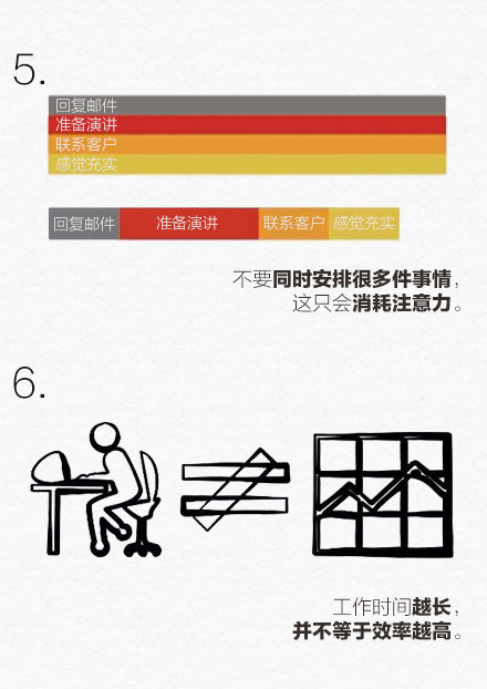 你为什么效率低下?①缺乏计划,做事没有头绪;②同时安排很多件事情,这只会消耗注意力;③拖延,永远停留在计划和准备阶段;④工作时间长,并不等于效率高;⑤不注意调节,疲劳工作……18条有效提升效率的技巧,帮你时间价值最大化!对照,思考,改进!
