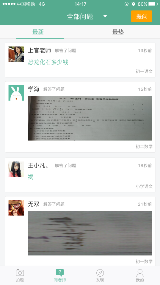 口袋老师 简介:口袋老师采用独特的闪电搜题技术,提供更快更准的拍照答疑体验,涵盖小学、初中、高中及各地中考、高考各科90%以上的题目,秒杀中小学学习作业难题!更有数万老师在线答题,专业讲解信任可靠,有答案更有讲解。 一、模块 1、拍题(拍照搜题) 2、问老师(范围:小学~高三) 3、发现(拍题攻略、意见反馈、分享给好友) 4、个人中心(我的:我的资料、我的提问、我的学豆) 二、功能特色 1、拍照搜题:作业一拍,答案秒出;数学、英语、语文、物理、化学等各科难题一网打尽!千万题库等你来搜。 2、免费问老师:答案不满意,免费问老师,名师在线抢答,所有问题都有答案。 3、不限次追问:问题没搞懂,追问老师,搞懂为止,真正将难题终结。 三、下载量(统计时间为2015-10-05) 1、百度手机助手:472万下载 2、360手机助手:79万下载 3、豌豆荚:4.2万下载 四、以下是内容屏幕截图及使用流程: 1、打开“口袋老师”的软件,界面如下: ![]() ![]() ![]() ![]() ![]() |