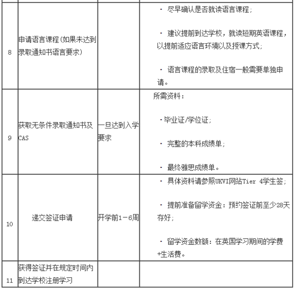 但是具体要提前多少时间规划呢?正常情况下一般需要1年的准备时间。笼统来说,留学所需要做的工作包括,英语考试,通知书申请,以及签证申请。 首先,英语考试的准备时间各不相同,一般来说在入读英国之前拿到达到入学要求的语言(雅思成绩)即可。所以,有人需要用半年的时间(从前一年的10月)准备并获得,有人可能就需要用更长时间来准备,例如1年甚至更长时间。虽然同学们可以多次参加雅思考试以获得理想成绩,但同时要注意,大部分学校会参考最后一次雅思考试成绩而不是最高雅思成绩,因此每次考试尽量保持成绩提升的态势。 其次,通知书申请。建议最早提前一年递交通知书申请,也就是从前一年的10月份递交,最晚递交通知书申请的时间不晚于入学当年的5月底。当然,根据英国大学和专业不同,申请截至的时间也各不相同,需要提前了解每个学校的要求。但是,一般来说,提前一年肯定不会晚。 通知书申请跟雅思成绩没有太大关系,一般学校不会要求在提交通知书申请的时候,同时提交雅思成绩,申请者只要在入学前提交合格的雅思成绩即可。因此,一般意义上的“通知书申请”指的是“有条件录取通知书”申请,所谓的条件一般指学生入读课程必须要达到的语言和学位水平要求。在达到“有条件录取通知书”所列明的条件的情况下,才能换取“无条件”入学。因此,对于应届毕业生来说,通知书申请的时间可能会持续一年,在本科毕业后才能最终确定是否会被学校录取。 最后是签证申请。签证的目的是获得入境英国的许可,需要在课程开学前拿到签证,然后到达英国大学学习。英国大学学位课程的开学时间一般为9月份(少部分学校有9月和1月2次开学),如果语言及学位条件均达到学校的入学要求,在9月份之前获得签证即可;如果语言未达到学校的入学要求(例如要求雅思7.0,只拿到6.5),按照学校要求,则需要提前一段时间就读英语课程,因此开学时间需要提前。英国使馆在收到签证申请后,一般需要15个工作日作出最终决定,因此,建议签证申请递交的时间需要在英国开学时间之前一个月左右递交。也就是说在递交签证之前,必须拿到学校的无条件录取,以及用于签证申请的CAS。