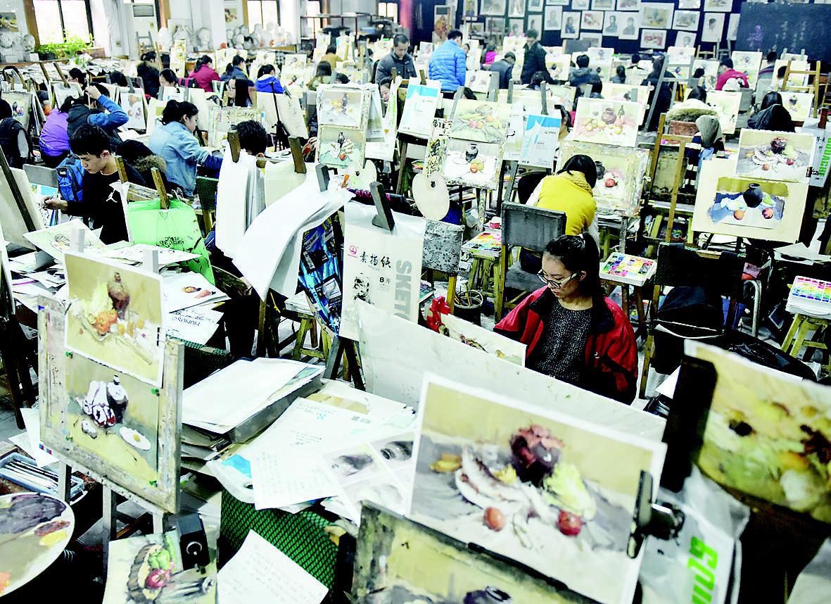 12月9日,距山西省2016美术联考还有不到半个月的时间,省城南内环某培训学校,艺术类高考生在一片“画海”中苦练基本功。