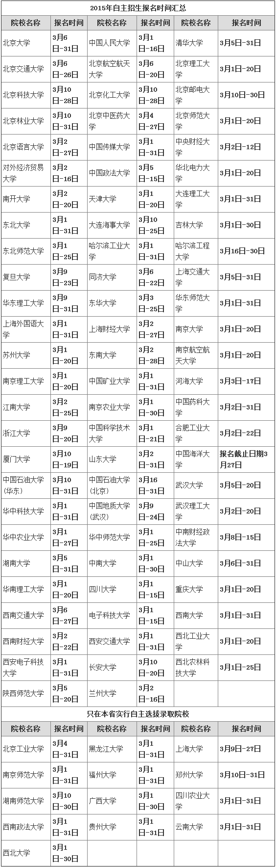 从高校陆续发布的2015年自主招生简章来看,报名时间大多集中在3月上半月,现汇总各高校报名时间,以供参考。