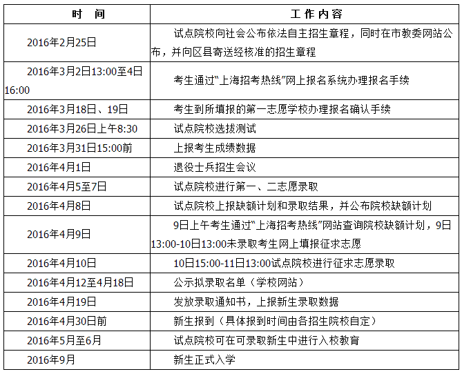 从上海招考热线获悉,2016年上海市部分普通高校专科层次实行依法自主招生改革试点方案发布。2016年度共有30所试点院校参加依法自主招生,报名时间为2016年3月2日13:00至3月4日16:00,考生可通过上海招考热线网上报名系统报名,过时系统将自动关闭,不再予以补报名。中国大学网现将2016年上海市部分高校专科层次实行依法自主招生改革试点工作日程表公布如下: ![]() |