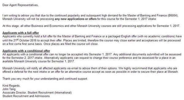 | 国庆节期间,澳洲高校那边传来了一个重要消息,作为澳洲八大之一的莫纳什大学,公布了商学院2017年2月开学的“银行与金融学硕士专业”(课程代码B6004)不再接受新申请。已经有打包录取或者无条件录取的,需要在10月21日接受录取;而有条件录取学生一律延期到2017年7月入学或者改其他专业就读。 原文如下: ![]() 澳洲学校的临时通知 因为没有设置太多的严格时间规定,所以澳洲大学会在需要的时候做出针对性的临时通知,比如我们开头讲到的莫纳什大学商科一硕士课程截止申请就是这样的通知。通常有必要发送紧急通知,是学校根据申请的数量和接受的情况,预计人数会大大超过学校容量而做出的提前调节和准备工作。澳洲八大院校比较容易发生这样的情况,有时候是语言直升班,有时候是商学院,工学院等非常热门的课程。7月,8月先是悉尼大学和新南威尔士大学语言直升班早早规定了截止日,现在又是莫纳什大学银行与金融学硕士不再接受新申请,之后不知道还有什么课程可能要早早满位…… 澳洲常规申请周期 实际上澳大利亚大学本科也好,硕士也好,一般是没有严格设定截止日期的,因为课程大多数都是2月和7月每年两次滚动开学,所以几乎是随时随地递交申请,学校也会以先到先得的形式受理,然后发放录取。不过,考虑学校申请受理周期和签证审理周期,一般都会有一个建议的时间。例如,申请每年2月开学的学生,建议是前一年的10月30日前截止,而7月开学的,则建议是当年3月30日前截止。这样算,预计申请学校和签证的时间是3个月,这要准备非常充分,条件很好,而学校和签证又要非常顺利的情况下实现。这是申请学校的参考截止日期。事实上,澳洲学校申请一般都是提前一年开始递交,签证是允许提前4个月递交,这样才是合理安全的时间规划。 有什么规避风险的方法呢? 一般来说,学校在发布新要求和紧急通知的时候,都会优先考虑已经获得录取的学生,通常都会给一个追溯日期,大多时候是获得录取的可以不因新政策受影响。所以,建议想申请澳洲留学的学生还是在确认可以递交申请后尽早递交申请,获得学校的录取。一般本科预科申请,需要高中3个学期成绩;硕士申请需要大学6学期成绩,学校才会受理并发放录取。 |