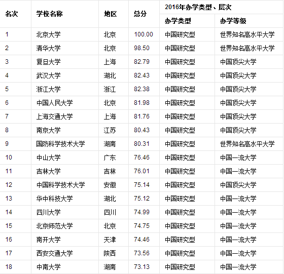 2016年1月11日,《2016中国大学评价研究报告》正式公布最新2016中国大学排行榜700强。其中,北京大学雄居2016中国大学排行榜榜首,实现9连冠;清华大学列第二,复旦大学居第三,武汉大学列第四,浙江大学居第五。以下是2016中国大学排名榜单Top100,供大家参考。 生源质量分析 “生源质量”指标排名显示,国内顶尖学生优先报考的依然是清华大学和北京大学,首年招生的中国科学院大学排名第3,其次是中国人民大学、南京大学、上海交通大学、复旦大学、中国科学技术大学、浙江大学和南开大学。前20名中也有中央财经大学、上海财经大学等财经类院校以及外交学院、北京外国语大学这些特色大学。新成立的地方高校上海科技大学首年招生,生源质量就跃居第48名。民办大学中排名前列的都是中外合作办学的大学,其中上海纽约大学排名最高,位列第33名,香港中文大学(深圳)第39名,宁波诺丁汉大学、西交利物浦大学、温州肯恩大学、北京师范大学-香港浸会大学联合国际学院分别排在第101、第133、第200、第260位。 科研经费分析 中国最好大学排名包括了对高校服务经济发展的能力和效果的评价。“企业科研经费”指标排名中,排名最高的是哈尔滨工业大学,年度企业科研经费达14亿元,天津大学以13.6亿元紧随其后,清华大学、北京航空航天大学、四川大学都纷纷跨入了10亿的大门。“校企合作论文”指标排名显示,中国石油大学(北京)以1459篇名列中国大学第一,清华大学以1187篇紧紧跟随,上海交通大学、中国地质大学(武汉)、浙江大学分别位列第3到第5名。“技术转让收入”指标排名显示,技术转让收入最多的是清华大学,为5.9亿元,第2名合肥工业大学为2.5亿元,东南大学、上海交通大学分别排在第3、第4名,福州大学2016年首次进入该榜,就以0.83亿排第5名。 |