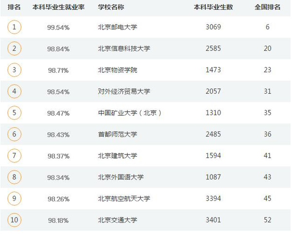 高校所在地区对就业也有着很重要的影响,根据2015年毕业生的就业数据统计北京地区高校的就业排行榜,出人意料的是,在2015年的就业率前十名中竟然没有清华北大,这个可能是由于清华北大出国以及深造的比例比较高因此就业率较低导致的。 北京邮电大学 对外经济贸易大学 中国矿业大学(北京) |