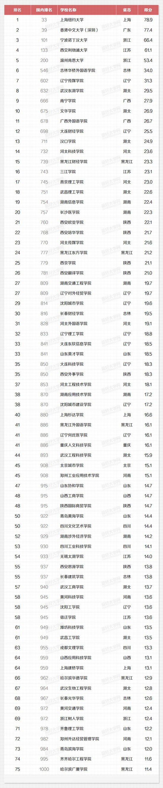 最好大学网近日发布“2016中国最好大学排名”,榜单中清华大学、北京大学、浙江大学、上海交通大学、复旦大学雄踞前五,成为中国高校金字塔尖端上的殿堂级学府。同时还公布了“2016生源质量排名”,国内共计1000余所高校上榜。 “2016生源质量排名”中,共有来自18个省市的75所民办高校上榜。其中辽宁省有10所,湖北8所,陕西7所,黑龙江、山东各有6所,河北、湖南各有5所,河南、吉林、江苏各有4所,上海、四川、浙江各有3所,广西、山西各有2所,北京、广东、重庆各有1所。 中外合作办学高校倍受考生青睐 排名前五的高校全部依托国外名校合作办学,并且在国内排名中位列前200。其中上海纽约大学位列国内33名,香港中文大学(深圳)首年招生便取得了全国39名的不俗成绩。宁波诺丁汉大学、西交利物浦大学则都在百强的门口跃跃欲试,温州肯恩大学也迈进了200强大门。 吉林华侨外国语学院列本土民办之首 本土民办高校在国内的生源质量排名中则出现了断层式下滑,第六名的吉林华侨外国语学院与第五名的温州肯恩大学相差346个名次,列国内第546名,这也是唯一一所进入前600的民办高校。7至10名依次是辽宁传媒学院(国内602名),武汉东湖学院(632名),南宁学院(666名),文华学院(675名)。 ![]() ![]() |