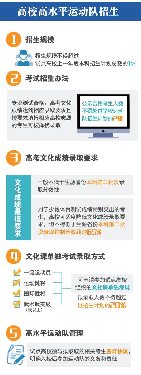 教育部近日部署2016年高校高水平运动队招生工作,要求有关试点高校严格控制招生规模、严格加强报名资格审核和测试选拔、严格规范录取。 教育部明确 凡不具备组队条件、未设立专项运动队、无法继续承担建队任务的试点高校,不得安排该项目高水平运动队招生。试点高校根据学校办学条件,依据世界大学生运动会设置的主流项目和高校高水平运动队管理要求,并按照程序调整运动队项目。鼓励和支持有条件的高校组建高水平足球运动队。高校高水平运动队招生规模不得超过试点高校上一年度本科招生计划总数的1%,并须在经教育部核准公布的运动项目范围内招生,其中集体项目每年招生人数不得超过该项目赛事规定的一方最多同时上场人数。试点高校公示合格考生人数不得超过学校运动队招生计划的2倍。 教育部要求 试点高校应加强考生报名资格审核,依据国家体育总局“运动员技术等级综合查询系统”核实考生运动技术等级。考生所持本人运动员技术等级证书中的运动项目应与报考高校的运动项目一致(原则上运动小项也应对应一致)。试点高校应面向广大考生开展反兴奋剂宣传教育,可联系国家体育总局开展兴奋剂抽查工作,体育专项测试之前,应与考生签订《反兴奋剂承诺书》。拒不签订承诺书或拒绝接受兴奋剂检查或抽查的考生,视为主动放弃考试资格。 教育部强调 要注重提高运动员的文化成绩录取要求。高校高水平运动队录取考生高考文化成绩最低要求,一般不低于生源省份本科第二批次录取控制分数线;对于少数体育测试成绩特别突出的考生,高校可适度降低文化成绩录取要求,但不得低于生源省份本科第二批次录取控制分数线的65%,高校公示的此类考生人数不得超过学校当年高水平运动队招生计划的30%。获得一级运动员、运动健将、国际健将及武术武英级(或以上)称号之一的考生,可申请参加试点高校组织的文化课单独考试,高校确定并公示的此类考生拟录取人数不得超过学校当年运动队招生计划的20%。高校要切实提高文化课单独考试的命题质量和选拔标准,不得为完成招生计划而降低或忽视文化课成绩要求。 教育部要求 有关试点高校要结合本校发展定位和人才培养要求,制订本校运动队招生计划、招生考试办法、录取考生高考文化成绩最低要求方案等。 |