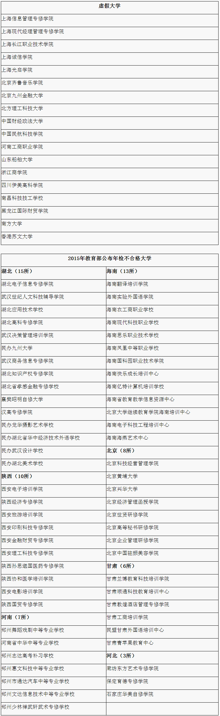 距离高考不足百天,考生们正处于紧张冲刺阶段,家长们也在“冲刺”挑选合适的大学。但家长们有没有想过,你为孩子挑选的不是高校,而是圈套? 3月15日,为维护广大考生、家长权益,高考帮发布《2016年中国大学报考警示榜》,其中包括18所虚假大学和2015年教育部公布的62所年检不合格大学。 据了解,此名单主要来自新闻媒体曝光、家长学生投诉,经高考帮一一确认进行整理而成。从《警示榜》可以发现,各类打着“正规高校”名号的不合格大学已经遍布多个省份,甚至蔓延到香港,并且名字也很“高大上”,诸如“香港苏文大学”、“中国财经政法大学”、“南方大学”听起来像正规高校,点进去会发现,它们的校园资讯、学校简介和某些正规高校如出一辙,极易混淆。 为此,高考帮负责人黄荣明在受访时向家长及考生“支招”--筛选高校时“三看、四对比”:“三看”是看“教育部当年公布的高校名单和具有高招资格的高校名单”、看“当地教育行政主管部门最新公布的民办高等教育机构的文件”、看“网站域名后缀是否为‘.edu.cn’”。“四对比”即对比“学校简介或概况,基本上都是抄袭而来”、对比“校网的结构、更新和图文等信息,极不像正规大学”、对比“办学许可证号或批准文号,要么造假要么‘年久失检’”、对比“互联网上不存在,不代表街头巷尾或电话中没有”。 2016年中国大学报考警示榜 ![]() |