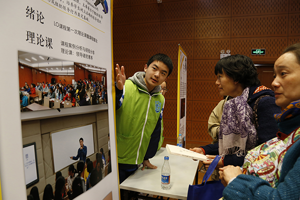 ![]() 上海中学校园开放日:家长们认真听取志愿者有关上中德育课程的介绍。 上海中学相关负责人表示,学校坚持“乐育菁英”的教育理念,以“聚焦志趣、激发潜能”为突破口,注重学生全面而有个性的发展,促进科技、工程、人文等不同类型创新人才的早期培育。为此,在当天的校园开放日里,上海中学专门安排了科技、工程等创新实验室参观、上中“慕课”学习体验、体育场馆游览与艺术品鉴互动等丰富多彩的特色活动。学校希望通过这些活动让前来参加活动的学子更深入地理解上中:上中的学生不仅会根据自己的兴趣去“学”,更会根据自己的志趣去“玩”。