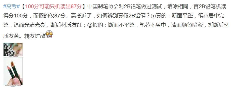 ![]() 据报道,早在2005年,中国制笔协会就曾做过对比。用一真两假3支2B铅笔参与测试,在填涂相同选项的情况下,机读卡识别结果是,真的2B铅笔得分是100分,而两支假的2B铅笔得分则是87分和99分。因此,考生购买时,最好到正规商场或超市。 支招:5招识别真假2B铅笔 一看标识,把几支铅笔放在一起比较,看笔杆三面上的“2B”标识位置是否完全相同,参差不齐即为假货。 二看质地,真品木质软硬适中,质地表里如一,呈暗红色;假货则只在顶端涂有红色,削开后木质为白色或淡黄;削铅笔时,假货木质过硬,容易劈裂。 三看包装,真品字迹印制精细,假货模糊,印距参差不齐,且油漆发乌,表面不光滑。 四看卷削,真品卷削顺利,假货卷削费劲,且木质纹理粗糙。 五看书写,真品书写基本不掉铅末,书写流畅,而假货则掉末、掉渣严重,书写时很涩,容易划撕纸面。 填涂非答题区也影响机读 除避免使用假冒2B铅笔外,考生答题时也要规范,切莫在机读卡非答题区域内填涂,否则不仅可能被认定为作弊,也有可能影响机读识别。 据介绍,在考试中读取答题卡采用光标阅读机。光标阅读机利用光电转换原理,将答题卡上的光学符号,转换成计算机能处理的电信号。当答题卡通过机器中的光电传感器时,填涂的信息位反射的光弱,未填涂的信息位反射的光强,转换成的电信号也有强弱之分,通过与正确答题卡填涂信息的比对,判断考生答题准确度。在答题区以外的区域填涂,可能会给机器造成混淆,影响机读成绩。 |