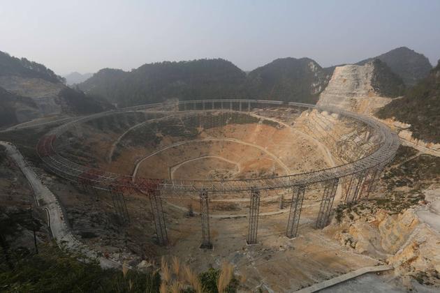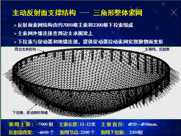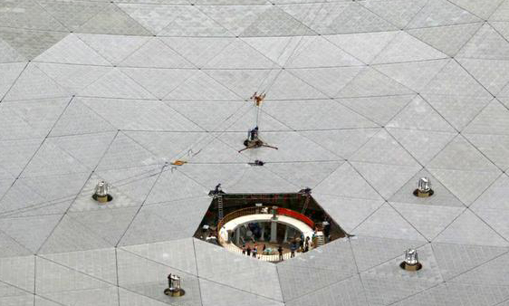2016年7月3日,贵州黔南群山中的FAST望远镜工程大窝凼台址现场,最后一块反射面板缓缓起吊,在完成了二次空中转接并用缆索吊下滑到指定位置后,被顺利安装在索网上。反射面工程也是FAST最后一个设备工程,其顺利完成标志着FAST工程主体工程的完工,将进入测试调试阶段。 FAST真名叫“500米口径球面射电望远镜(Five-hundred-meter Aperture Spherical radio Telescope, FAST)”,是目前世界第一大单口径射电望远镜,今日完成安装的主动反射面是FAST望远镜的重要组成部分,共有4450块的反射面板单元,总重量超过2000吨,反射面总面积约25万平方米,相当于近30个足球场,其工程量之大由此可见,是我国目前最大的天文工程。 FAST望远镜建成后将超过全球现役最大球面射电望远镜——300米口径的阿雷西博(Arecibo),成为世界上最大口径的射电望远镜,与号称“地面最大的机器”的德国波恩100米望远镜相比,灵敏度提高约10倍;与排在阿波罗登月之前、被评为人类20世纪十大工程之首的美国阿雷西博,其综合性能提高约10倍,将在未来20~30年保持世界一流设备的地位。 理论上,FAST投入使用后,能接收到137亿光年外的电磁信号,接近于宇宙的边缘,除了巡视宇宙中的中性氢,研究宇宙大尺度物理学,以探索宇宙起源和演化,还将观测脉冲星,研究极端状态下的物质结构与物理规律;甚至可以搜索星际通讯信号,开展对地外文明的探索。 ![]() ![]() 1994年4月,FAST项目启动贵州选址工作,开始了为期13年的预研究;直到2007年7月10日, FAST项目正式立项。 ![]() 大窝凼‘快鸟’照片 ![]() 原来的大窝凼住着12户人家 后来整体搬迁 原本无比静谧的贵州省平塘县克度镇金科村大窝凼洼地,是专家们先根据卫星遥感影像,对400多个备选洼地从形态特征、水文、地质、气象及电波环境等诸多方面进行初评,然后又通过计算机模拟工程填挖量,从中选出30多个实地考察,最后才选中了不大不小,深度合适,形状很圆,适于施工建设的“大窝凼”。 这个天然洼地附近5公里半径之内没有一个乡镇,25公里半径之内只有一个县城,无线电环境“相当理想”,加上贵州南部喀斯特峰丛洼地的特殊地貌,天坑底部多有暗河和落水洞,FAST望远镜的底部在暗河基础上又修了一公里的引水渠,可以保障雨水向下渗透,不会腐蚀到望远镜。 利用贵州天然的喀斯特洼坑作为台址是FAST工程的三项自主创新之一,但这样有着天然优势的地貌也给项目建设施工带来了很大困难,在70度以上的峭壁上铺设线路,必须用人力开挖,电缆和巨型设备也只能靠人力搬运,在天坑中建筑空间腾挪不开,为此施工人员用人工把几十座钢梁和几十段框架,一点点搬运到恰当的位置。 能动的“天眼” FAST的天线锅反射面口径500米,基准状态下呈现半径300米的球面,反射面下有精巧的索网结构作为主要支撑结构,这些索网就是反射面“变形”的关键点,FAST索网是世界上跨度最大、精度最高的索网结构,也是世界上第一个采用变位工作方式的索网体系。 ![]() ![]() 环形圈梁 ![]() 反射面板安装反射面板安装
