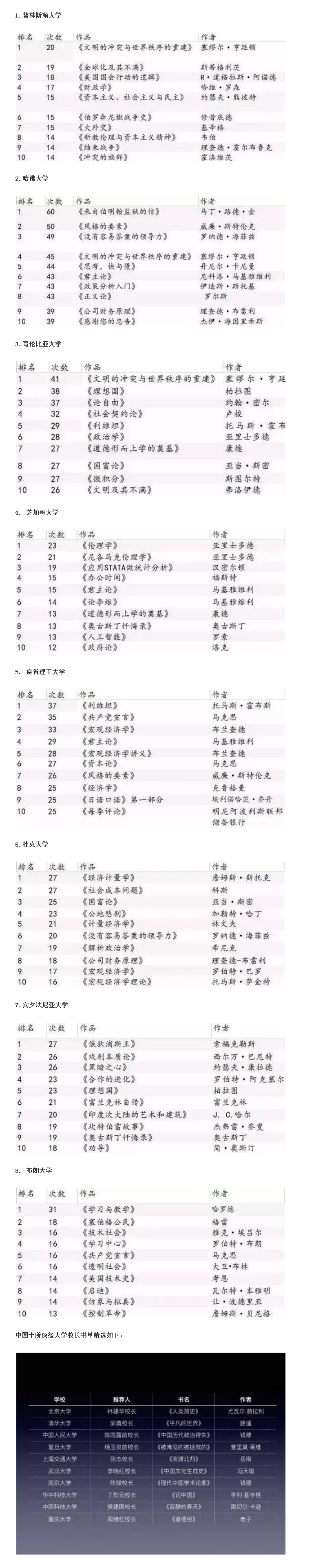 话说人生得到的许多哲理来源是通过读书得到的,这句话说得一点都没有错,一本好书能写得精彩,说明这个作家的文化水平很高。人生经历丰富,通过自己的人生观念、人生感叹才写的出来这么棒的文章。 最近美国媒体Quartz近期公布了一组图表,列出了过去15年来10所美国顶尖大学课堂上被教授推荐最多的作品,及各自出现的次数。 今天为大家整理出来,希望通过这些高校推荐的书籍给大家在人生导向上作出一个全新的引导。 ★ 首先带大家看看美国顶尖大学生们都在读什么书来提升自己的内涵修养。 ![]() 可以看出,大家更多看的事哲学相关的书籍,看来大大学里面学习哲学、政治学的同学要好好阅读此作品。 下面是世界各著名大学的学生看的书籍,看看大家都在看什么? ![]() |