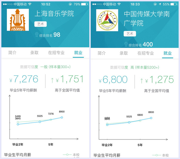 不过艺术类考生的付出和考入大学的机会并不成正比,比如艺术课程的培训费上则几万,多则十万以上,随着近年来不断壮大的艺考队伍,数据显示艺考的录取率在35%左右,而普通本科的录取概率是44%。考生和家长需及时关注各校的招生信息,包括招生人数和在各省的录取比例等,选择合适的学校报考。 随着社会经济水平的发展和提高,人们对精神文化的需求迅速增长,再加上艺术类毕业生总体数量少,所以有一技之长的艺术类学生就业前景广阔。而一旦取得成绩成为名人,收入更是十分可观。完美志愿经过4000万大学生的就业数据分析发现,不少艺术学校的就业薪酬高于全国平均值。