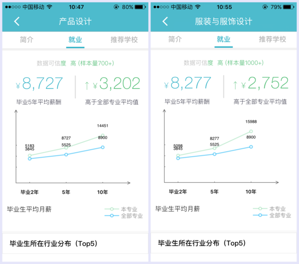 艺考的专业选择同要重要,各专业方向就业前景也有较大的区别。完美志愿查询显示,如果学美术方向的专业,产品设计、服装与服饰设计、数字媒体艺术、工艺美术等专业毕业五年的平均月薪就高于全国平均值,排名前五十。