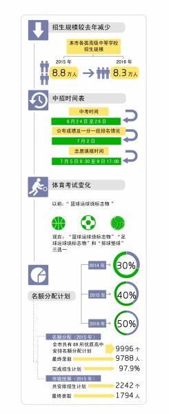 ![]() 普通高中招生约5.5万人 2016年本市各类高级中等学校招生规模为8.3万人,和去年的8.8万人相比,今年招生规模有所减少。其中普通高中招生规模约5.5万人,中等职业教育招生规模约2.8万人。 中等职业教育招生规模中,五年制高等职业教育(含贯通培养)招生规模9000人,普通中等专业学校招生规模7000人,职业高中招生规模6000人,技工院校招生规模6000人。招生规模减少的主要原因是参加中考的考生有所减少。 今年初中毕业会考和高级中等学校招生考试将继续分开进行。所有高级中等学校招收的学生必须参加2016年北京市高级中等学校招生考试。 中考时间仍为6月24日至26日,7月2日将公布成绩,同时在考试院网站上按一分一段公布各区中考成绩分布情况,为考生填报志愿提供参考。志愿填报时间为7月5日8:30至9日17:00。 报考仍旧分为名额分配志愿和统招志愿。名额分配批次共设8个志愿,每个志愿学校可填报一个专业。统招批次共设8个志愿,每个志愿学校可填报2个专业,考生可根据自身情况选择填报。 命题更重阅读和实验探究 从今年起,中招考生志愿填报方式调整为考试后知分填报。 对此,市教委相关负责人解释称,考后知分填报志愿,是在确保公平、公开、公正的前提下,体现以考生为本,为考生提供优质服务,既有利于信息公开透明,有利于考生选择学校和专业,降低志愿落空的风险,增加录取机会,又有利于考生考前集中精力备考。 “对于这项变化,考生考前应集中精力复习功课,了解今年的各项招生政策,比如名额分配、市级统筹,出了分数后,根据自己的成绩在学校、区的排名,自己的爱好和特长,以及家里的实际情况来综合考虑。”市教委相关负责人支招。 此外,据市教委负责人透露,中考考试内容将选择更为宽广的试题素材,融通学校教育、家庭教育和社会教育,考查学生对基础知识、基本技能的掌握和提出问题、分析问题、解决问题的能力。“今年中考命题将更加注重选作题的设计,更加注重阅读考查,更加注重实验探究的考查。” 好资源向一般初中校倾斜 根据“2016年中招意见”,普通高中招生要保证适度规模,其中公办普通高中招生应控制在每班不超过45人。 近年来,为加大对一般初中的招生力度,让普通初中校的毕业生有更多机会就读优质高中,北京实行了优质高中部分招生计划分配到初中校的政策,而且名额分配的比例逐步扩大。以优质高中为单位,在2014年30%招生比例、去年40%招生比例的基础上,今年将“名额分配”总体比例提高到50%左右。今年共有89所学校参加。 “名额分配的增量将主要投向一般初中。”市教委有关负责人介绍,今年“名额分配”新增的10%招生比例主要用于一般初中校的毕业生,从而确保今年本市一般初中校毕业生有30%以上获得进入优质高中的机会。 市教委负责人介绍,这个目标通过两个途径实现,一是优质高中的名额分配的计划不减少;二是将鼓励优质高中扩大招生规模,增加部分用于市级优质教育资源统筹。 名额分配计划中包括名额分配和市级统筹两部分。其中示范高中名额分配计划数与去年相同,市级统筹招生人数将增加,方式也将有所变化。“今年市级统筹中将新增一种招生模式,即城六区优质高中要拿出近3000个招生计划,投放到一般初中校,使得每所一般初中校30%的学生都能有升入优质高中的机会。这近3000个计划是优质高中计划的纯增量,不影响其他初中校学生升学。”市教委负责人解释称。 不过,考虑到一般初中校学生的实际情况,今年录取时不会“一刀切”,而是划定了分数线。具体来说,新增的名额分配计划将直接分配到各初中校,填报志愿的考生将在各自学校按分排队,但录取时其分数不能低于500分。 贯通培养项目将新增学校 去年中考、中招中,北京首次引入高端技术技能人才贯通培养试验项目,主要由优质高中、中高职学校、市属本科高校一体化培养人才,融通各类资源。专业也都是对接首都经济社会发展和产业转型升级需要,培养首都急需的高端技术技能人才。 去年本市共6所学校开展了“5+2”高端技术技能人才贯通培养试验,共安排招生计划2270人,最终录取2009人,完成招生计划的88.5%。“5+2”高端技术技能人才贯通培养试验招收本市户籍初中毕业生。学生完成高中阶段基础文化课学习后,接受高职教育和本科专业教育。其中,本科教育通过专升本转段录取。去年的贯通培养项目设置了最低录取分数线,提招批次最低录取分数线为460分,统招批次最低录取分数线为430分。 今年,参与“5+2”贯通培养项目的学校,除了原先的两所中职、三所高职和北京第二外国语学院一所本科院校外,还将新增北京城市学院、首都师范大学、北京联合大学等本科院校,以及其他一些高职院校。 体育考试项目增加选择性 今年北京中考中的体育考试,将原来的“篮球运球绕标志物”必选项目改为在“篮球运球绕标志物”“足球运球绕标志物”和“排球垫球”三个项目中任选一个,扩大了考试项目的选择性。 对此,市教委相关负责人称,体育考试科目由原来指定的单项科目逐渐扩大到现在的多项科目,其实考试设计的最终目的是促进学生的身心健康。引导学生有健康的生活目标和体质锻炼习惯,这是考试改革的最终方向。 据悉,今年全市体育现场考试安排在5月1日—31日进行。体育考试将统一考试项目、统一成绩评定标准、