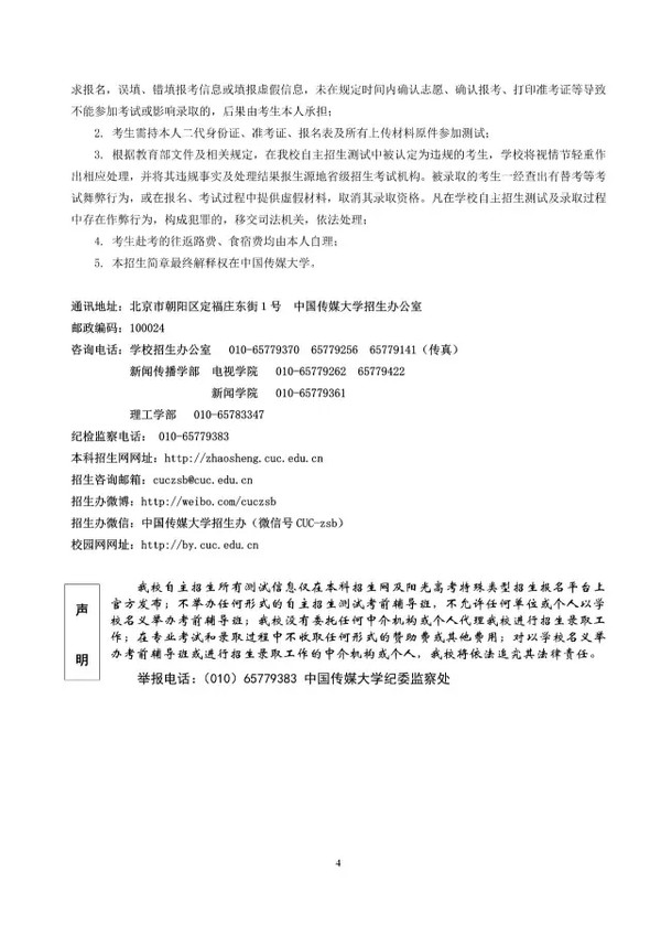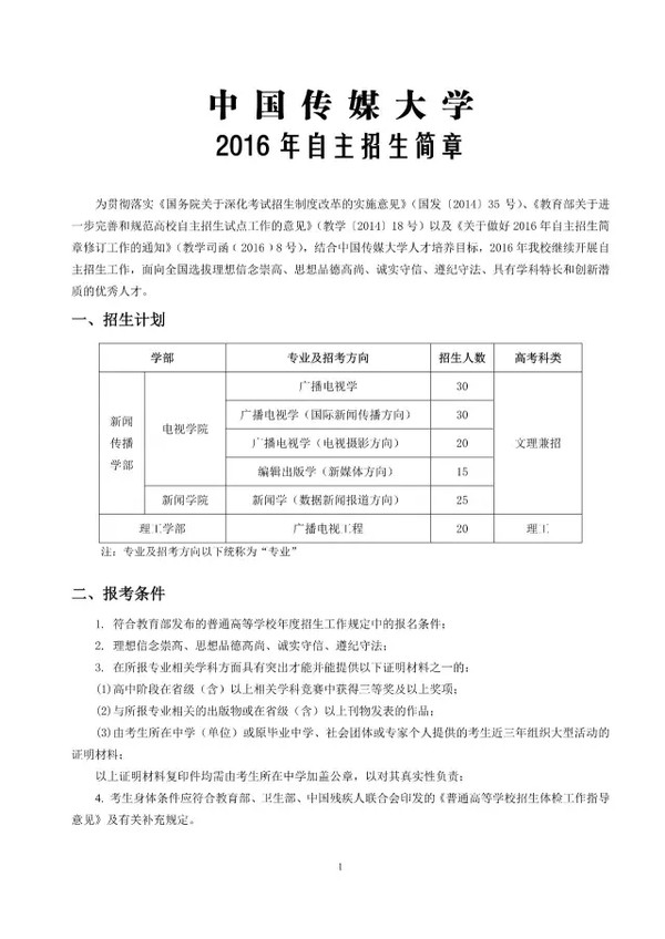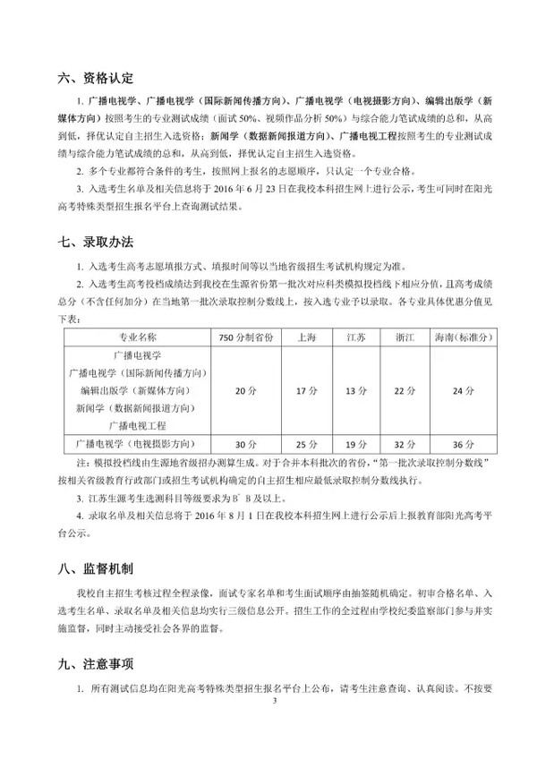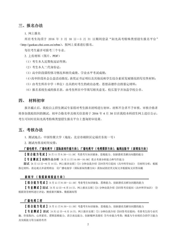 中国传媒大学2016年自主招生专业介绍 广播电视学 作为国家级特色专业之一,本专业根据广播电视领域发展的现实需要和未来前景,侧重培养具备良好的政治素养、广博的文化知识、敏锐的社会观察力、宽阔的国际视野和娴熟的专业技能的人才;培养具有开拓创新精神和深入开展社会调查研究的能力,能够在各类传媒机构、文化宣传单位和其他企事业单位从事广播电视节目制作、策划、管理等工作的专业人才。为适应电视新闻直播的发展趋势,努力提升学生在现场生产制作新闻的能力,本专业优化“出镜记者”特色发展模式,开拓性地建设了直播与现场报道的实验教学平台,使学生在口语表达与新闻敏感、快速写作与反应能力、出镜报道与主持等方面得到更多实战训练,培养学生在现场发现、挖掘、思考并形成观点的能力。本专业采取自主招生+普招相结合的招考方式。 【特色培养】 1.英语实验班:学生在入学时通过英语选拔,可进入电视学院“英语实验班”进行学习,目标是培养优秀的后备国际新闻传播人才。 2.英语节目主持班:学生在入学后经过一年的培养,可以通过选拔进入“英语节目主持”特色班,强化训练运用双语(英语、汉语)进行广播电视节目的采访与报道,熟练掌握国际新闻写作、编辑、评论等新闻业务技能。 3.出镜记者班:学生在完成两年的学习后,通过自愿报名、公开选拔的方式,可进入出镜记者班学习。该班精心设置了后续课程,聘请业界知名记者、主持人和专家学者担任主讲教师,目标是为各级电视台和新闻传媒机构培养专门的出镜记者和主持人。 4.国际教授工作室:学生通过选拔可进入我校“国际教授工作室”学习先进的传媒理念与前沿特色课程,目标是拓展国际化视野,培养国际传媒精英创新人才。 5.多项奖学金:除国家级、校级奖学金外,学院特设“国际新闻校友奖学金”、“北大未名奖助学金”、“小马奔腾奖学金”、“优胜·展望”奖学金”、“湛庐奖学金”等多项社会奖学金,激发学生的实践创新精神,鼓励专业创作。 【主干课程】 新闻理论、中外新闻传播史、新闻写作、电视节目制作技术、摄影元素构成、电视传播概论、电视采访、电视写作、广播电视评论、电视现场报道、电视新闻学、国际新闻理论与实务 广播电视学(国际新闻传播方向) 广播电视学(国际新闻传播方向)专业的前身为英语(国际新闻方向)。本专业根据国际新闻传播发展的现实需要和未来前景,侧重培养具备良好的政治素养、广博的文化知识、敏锐的社会观察力、宽阔的国际视野和娴熟的专业技能,适应对外宣传及涉外新闻报道等多方面需要的国际传播应用型人才。本专业学生不仅具有坚实的英语语言专业理论基础,良好的中英文语言表达和写作技能,同时具备采、写、编、评、译、制等国际新闻业务能力,能够从事记者、编辑、翻译、评论员及其他涉外管理工作等。 【特色培养】 1.英语节目主持班:学生在入学后经过一年的培养,可以通过选拔进入“英语节目主持”特色班,强化训练运用双语(英语、汉语)进行广播电视节目的采访与报道,熟练掌握国际新闻写作、编辑、编译、评论等新闻业务技能。 2.出镜记者班:学生在完成两年的学习后,通过自愿报名、公开选拔的方式,可进入出镜记者班学习。该班精心设置了后续课程,聘请业界知名记者、主持人和专家学者担任主讲教师,目标是为各级电视台和新闻传媒机构培养专门的出镜记者和主持人。 3.国际教授工作室:学生通过选拔可进入我校“国际教授工作室”学习先进的传媒理念与前沿特色课程,目标是拓展国际化视野,培养国际传媒精英创新人才。 4.多项奖学金:除国家级、校级奖学金外,学院特设“国际新闻校友奖学金”、“北大未名奖助学金”、“小马奔腾奖学金”、“优胜·展望”奖学金”、“湛庐奖学金”等多项社会奖学金,激发学生的实践创新精神,鼓励专业创作。 【主干课程】 国际新闻理论、国际新闻史、英语报刊新闻采写、英语广播电视新闻采写、国际新闻评论、英语新闻节目制作、英语新闻节目研 广播电视学(电视摄影方向) 本专业着眼于我国电视事业未来发展的需要,力求将本专业学生培养成为具备广博的科学文化知识,具备电视传播和影视艺术理论知识,具有创造性思维和艺术创造力,熟练掌握影视摄影技能和制作技巧,具有较强的新闻敏感和节目统筹能力,兼顾电视摄影创作和后期制作能力的高级摄影师和优秀摄影记者。该专业的前身摄影(电视摄影方向)是中国传媒大学历史最悠久的专业之一,拥有雄厚的师资力量。2009年,摄影(电视摄影方向)教学团队被评为北京市优秀教学团队。为培养摄影专业学生的实践创新能力,本专业为学生创造集体外出拍摄、采风的机会,组织学生创作摄影作品并参加一年一度的中国平遥国际摄影大展。 本专业毕业生主要在电视台、影视制作公司、广告公司、音像出版社、电视研究机构、网络视频部门从事新闻摄影、纪录片摄影、影视剧摄影、广告摄影以及各类节目的摄影摄像以及编导工作。 【特色培养】 1.英语实验班:学生在入学时通过英语选拔,可进入电视学院“英语实验班”进行学习,目标是培养优秀的后备国际新闻传播人才。 2.出镜记者班:学生在完成两年的学习后,通过自愿报名、公开选拔的方式,可进入出镜记者班学习。该