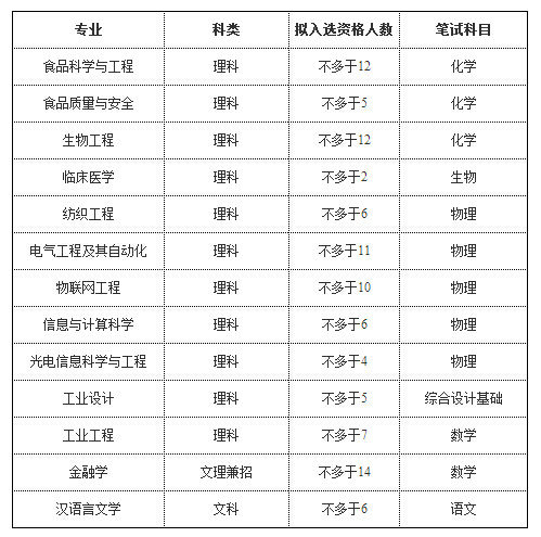 江南大学是教育部直属、国家“211工程”重点建设高校(“九五”首批入选)。学校坐落于太湖之滨的江南名城——江苏省无锡市,校园占地3200亩,风景秀丽、宁静和谐、曲水流觞、设施先进,获教育部校园规划一等奖,被评为全国高校校园环境满意度50强。智能与人文情怀的美丽校园为青年学子的学习生活提供了优越的环境,是造就人才的理想之地。 根据《教育部关于进一步完善和规范高校自主招生试点工作的意见》(教学〔2014〕18号)文件精神,2016年学校将遵循“促进公平、科学选才、监督有力”的原则,继续招收具有学科特长和创新潜质的优秀高中毕业生。 一、招生专业及计划 我校2016年面向全国自主招生,招生计划数不超过83人,拟入选资格人数不超过自主招生计划的1.2倍。考生根据高考报名科类以及自身学科特长、创新潜质报考相应专业,具体招生专业及拟入选资格人数如下表: 理想信念坚定,思想品德优良,诚实守信,遵纪守法,身心健康,且符合下述条件之一者均可申请: 二、报名条件 (一)高中阶段获得全国中学生(数学、物理、化学、生物学、信息学)奥林匹克竞赛国家集训队资格或全国决赛一、二、三等奖或省级赛区一、二等奖。 (二)高中阶段获得全国青少年科技创新大赛(含全国青少年生物和环境科学实践活动)、“明天小小科学家”奖励活动、全国中小学电脑制作活动一、二等奖,国际科学与工程大奖赛或国际环境科研项目奥林匹克竞赛奖项。 (三)高中阶段参加全国性作文比赛获二等奖及以上(具体赛事名称为“叶圣陶杯”全国中学生新作文大赛、全国新概念作文大赛、全国中小学生创新作文大赛、“语文报杯”全国中学生作文大赛)。 (四)高中阶段获得国家知识产权局颁发的发明专利证书(第一专利授权人)。 (五)高中阶段在省级以上专业刊物公开发表论文一篇(含)以上(第一作者),或正式出版专著(第一作者)。 (六)对于所报专业有着浓厚兴趣,在相关专业领域确有学科特长或创新潜质。考生须提供高中阶段与所报专业相关的学科特长或创新潜质证明材料。 三、报名流程 (一)考生网上报名(3月15日—3月31日) 考生须在规定时间内登录“特殊类型招生报名平台”(以下简称报名系统),网址为http://gaokao.chsi.com.cn/zzbm,按相关提示、要求完成网上报名,每人限报一个专业。 1、个人陈述包括自身成长与发展情况,个人学科特长或创新潜质所取得的成果,对所报专业的认识及专业发展理想等内容,从高中阶段写起,字数800字左右。 2、考生提供的附加证明材料包括:(1)学科特长、创新潜质证明材料:选取最具代表性的证明材料,不超过3张;(2)综合素质评价表(主要包括思想品德、学业水平、身心健康、艺术素养和社会实践等五个方面内容)。上述材料均须由中学审核并加盖红色公章。 3、考生信息填写完整后,下载打印报名申请表,并由考生本人、所在中学在申请表相应位置签字、签署意见和盖章。 4、申请表及所有材料均须上传报名系统,无需邮寄任何纸质材料。特别注意,上传系统的纸质申请表的版本号须与系统显示的版本号一致。 (二)推荐人(单位)上传推荐材料(3月31日前) 如考生由所在中学、社会团体或行业、领域专家等实名推荐,推荐人(单位)需按照报名系统要求提供推荐材料并对其真实性负责,并上传系统。推荐中学或社会团体须在推荐材料上加盖单位公章。 特别说明:考生的所有报名材料均须真实、完整、清晰可辨。材料中若存在虚假内容或者隐匿可能对考生产生不利影响的重大事实的,一经查实,取消继续参与后续认定工作的资格;已经获得自主招生认定资格的,取消认定;已经入学的,按教育部和学校相关规定处理。 (三)报名测试费 根据苏价费〔2007〕423号、苏财综〔2007〕92号、苏教财〔2007〕89号文件精神,60元/人。 四、选拔程序 (一)材料初审 学校组织由学科专家和相关部门工作人员组成的审核工作组根据报名材料对考生进行资格初审,并确定初审合格名单。 考生可于4月30日后登录报名系统,查询初审结果。初审合格者,请查阅报名系统及江南大学本科招生网发布的网上交费确认、现场确认、考核安排及考核要求等相关通知。 (二)考核 6月11日、12日进行考核,如有调整,以江南大学本科招生网公布信息为准。 1、笔试:时间2小时,满分150分。考试科目见“招生专业及计划”笔试科目。 2、面试:满分100分。结合学校相关学科、专业特色及培养要求,组织相关学科专家进行面试,考核过程全程录像,专家名单和考生面试顺序随机确定。 (三)资格确定 学校本着择优录取、宁缺勿滥的原则,根据考生笔试成绩(50%)和面试成绩(50%)加权折算后的综合成绩、自主招生各专业计划和生源等相关情况,由招生工作领导小组审核确定自主招生各专业入选资格名单,其中各专业综合成绩前30%为A类政策,其余70%为B类政策。 (四)志愿填报 填报方式、填报时间等按生源地省级招生考试机构的统一安排和我校要求填报。入选资格考生,填报的高考专业志愿须与公示的专业一致,否则视为放弃我校自主招生录取资格。 请考生及时关注江南大学本科招生网和报名系统公布的自主招生相关通知与信息。 五、录取政策 根据入选资格考生自主招生志愿、高考成绩总分、经公示的优惠分值、入选专业和学校模拟投档线进行录取。 A类:高考成绩达到所在省(市、区)第一批次